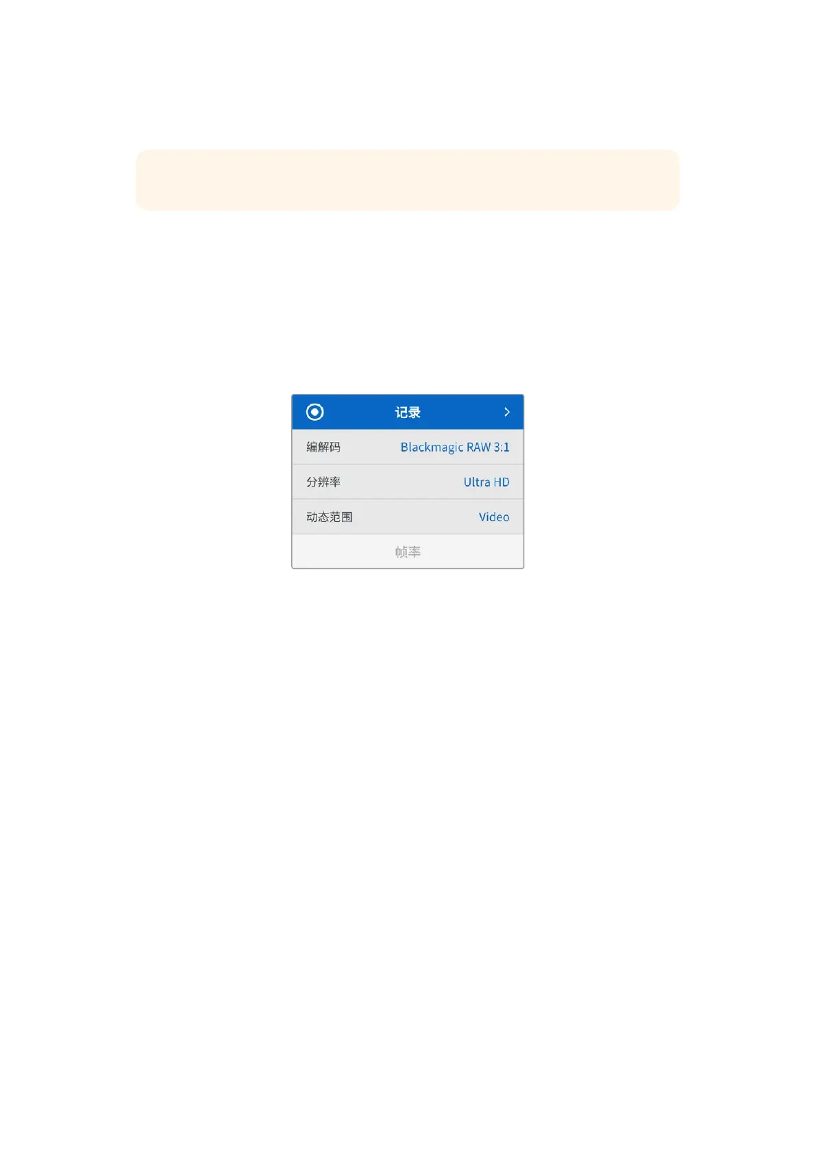 “记录”菜单可用来设置视频编解码以及记录视频所需的其他重要设置,例如动态范围和细节锐化等。