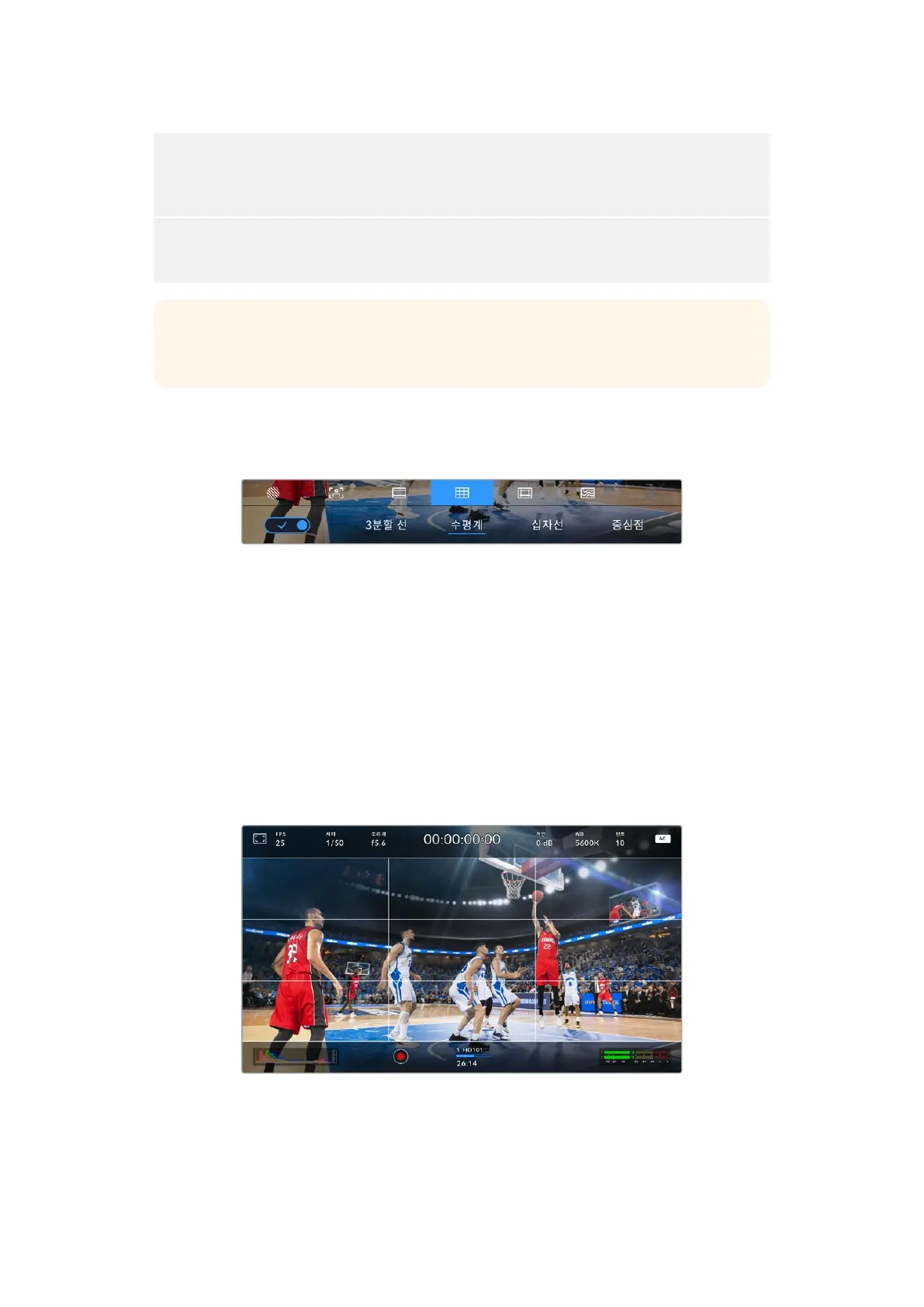 그리드와 십자선은 영상의 구도를 잡는 데 도움이 되는 오버레이입니다. 그리드가 활성화되면