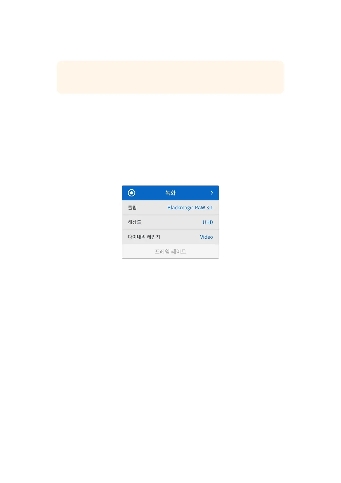 ‘코덱’ 메뉴에서는 외부 미디어 녹화 시, Blackmagic RAW의 화질을 설정할 수 있습니다. ‘고정