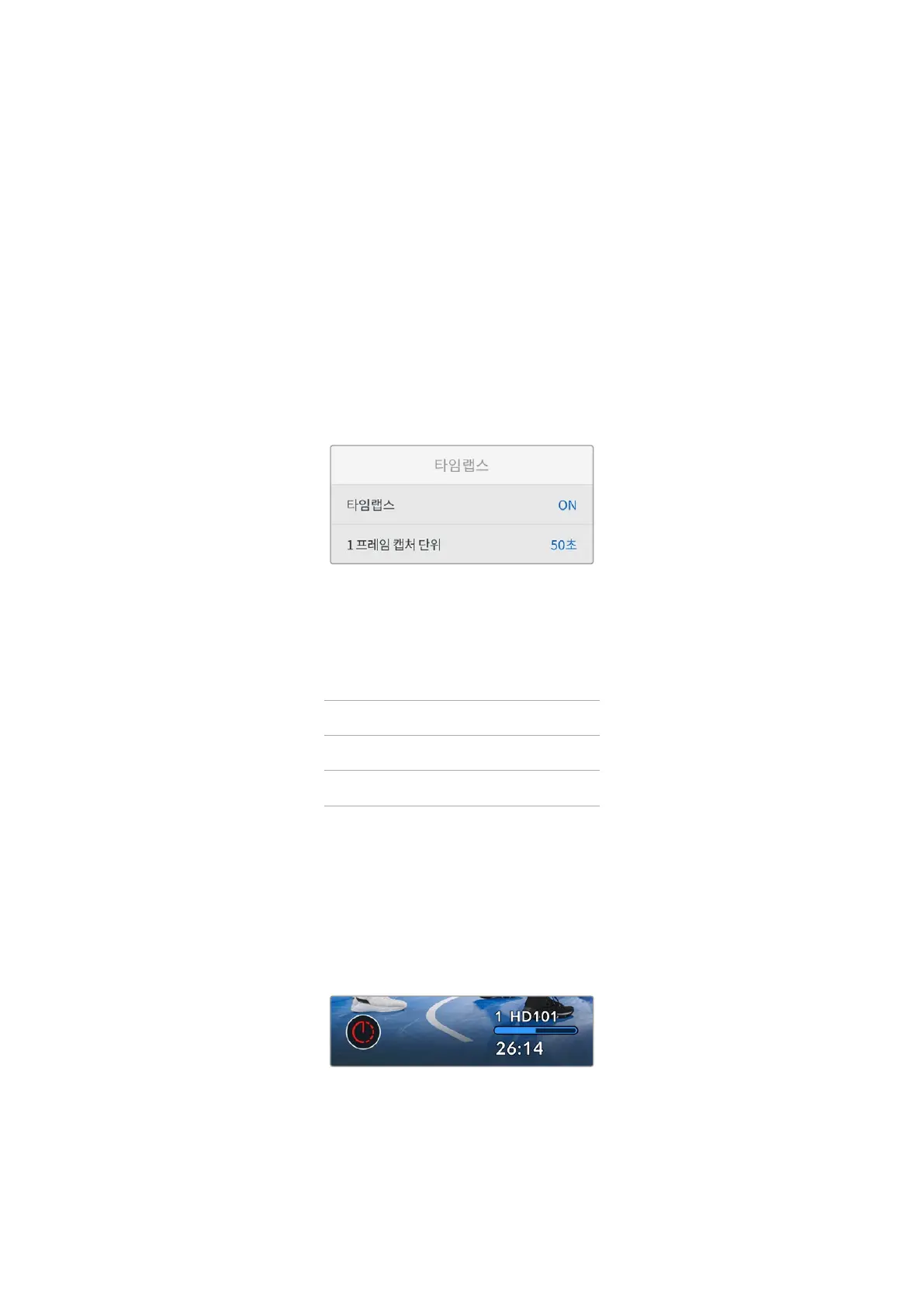 이 설정을 사용하면 다음과 같은 간격으로 스틸 프레임을 자동 녹화하도록 타임랩스 기능이 활성화됩니다.