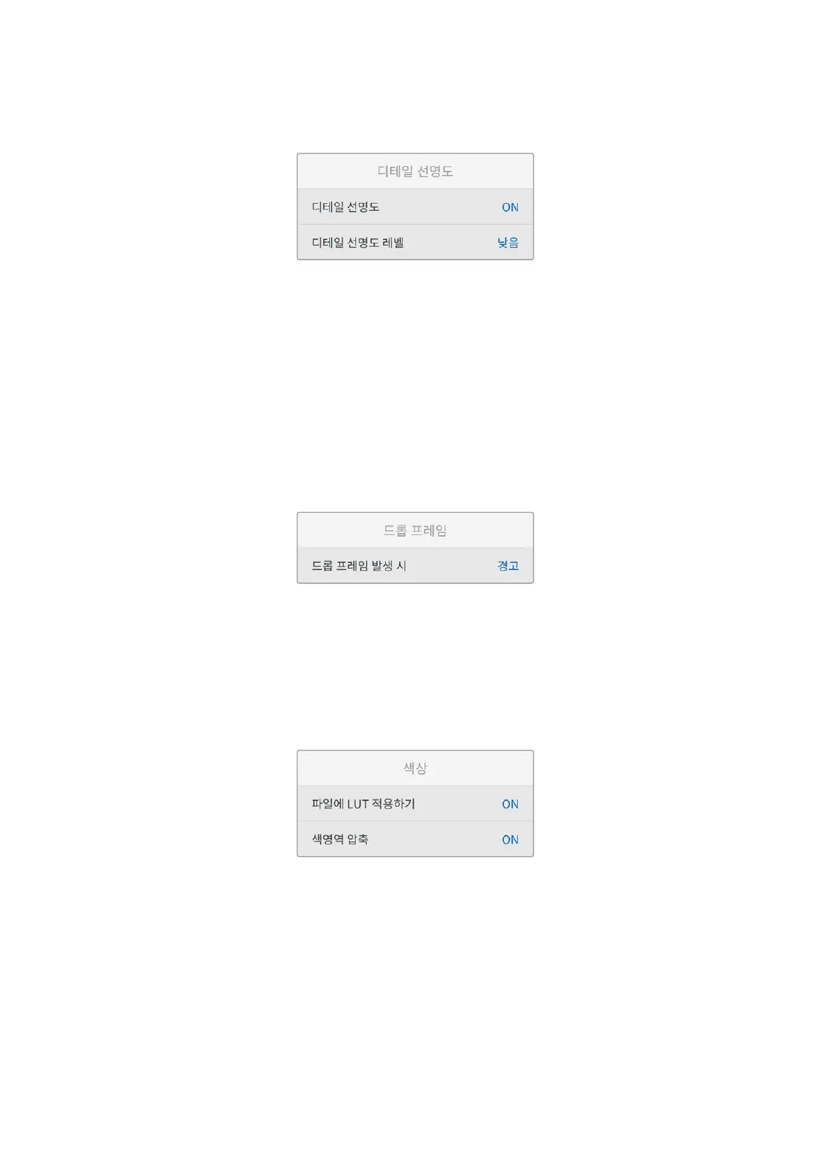이 설정을 통해 드롭 프레임 현상이 감지됐을 때의 카메라 작동 방식을 설정할 수 있습니다. ‘OFF’로