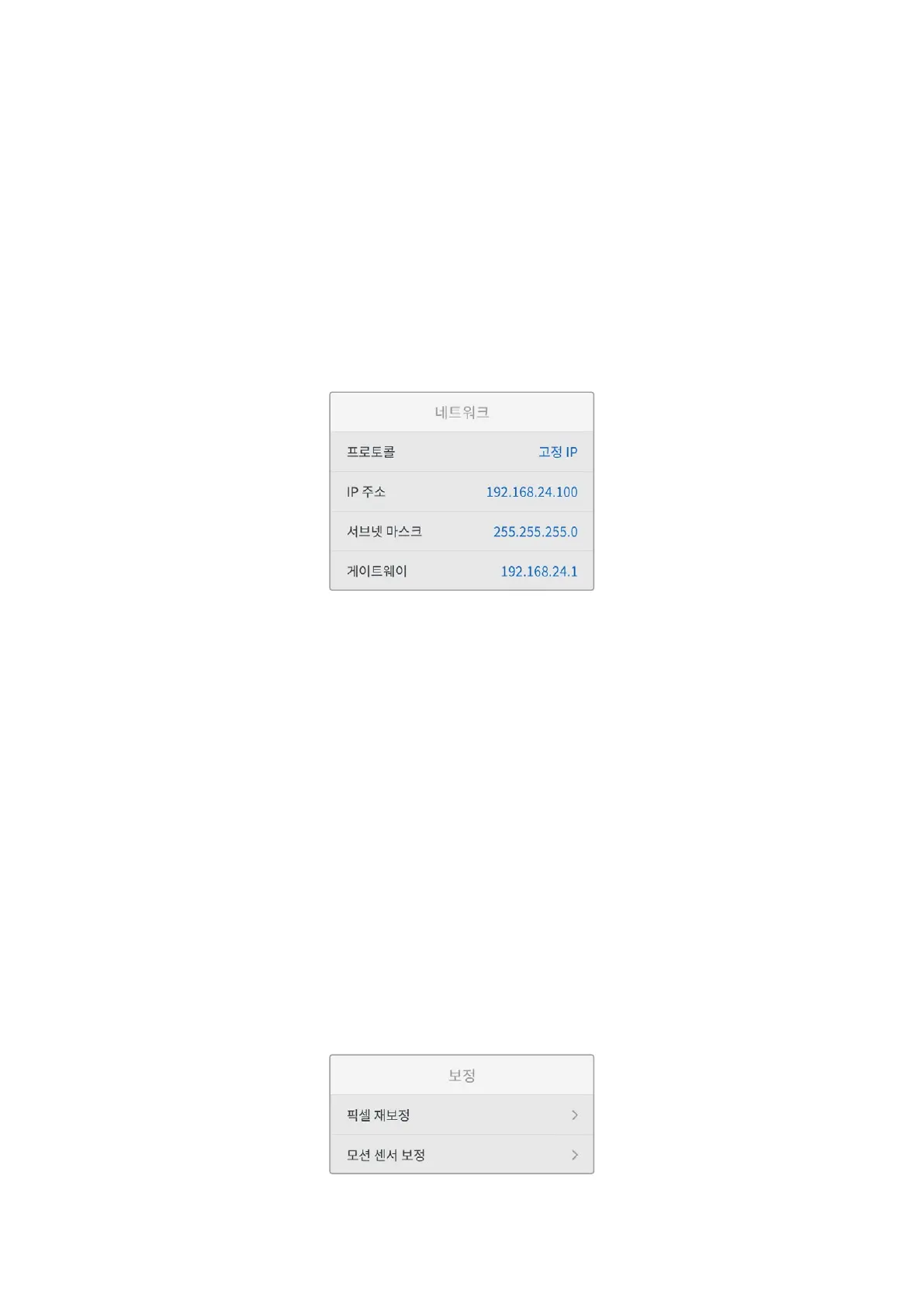 화살표 버튼을 사용하여 IP 주소를 조절하고, ‘업데이트’를 눌러 설정을 확인한 이후 다음 설정값을