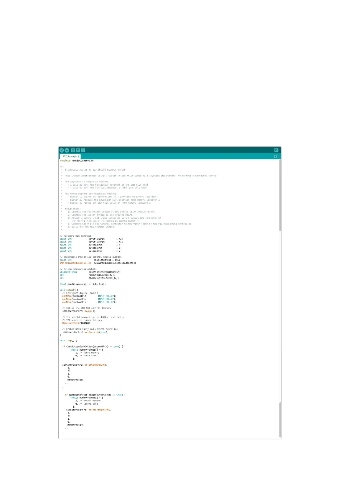 anArduino board and the Blackmagic 3G-SDI Arduino Shield, to control a PTZ head via a