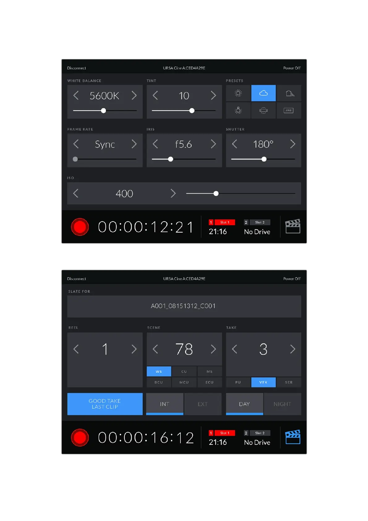 Once paired, Blackmagic Camera Control will display this screen, allowing you to adjust your settings and