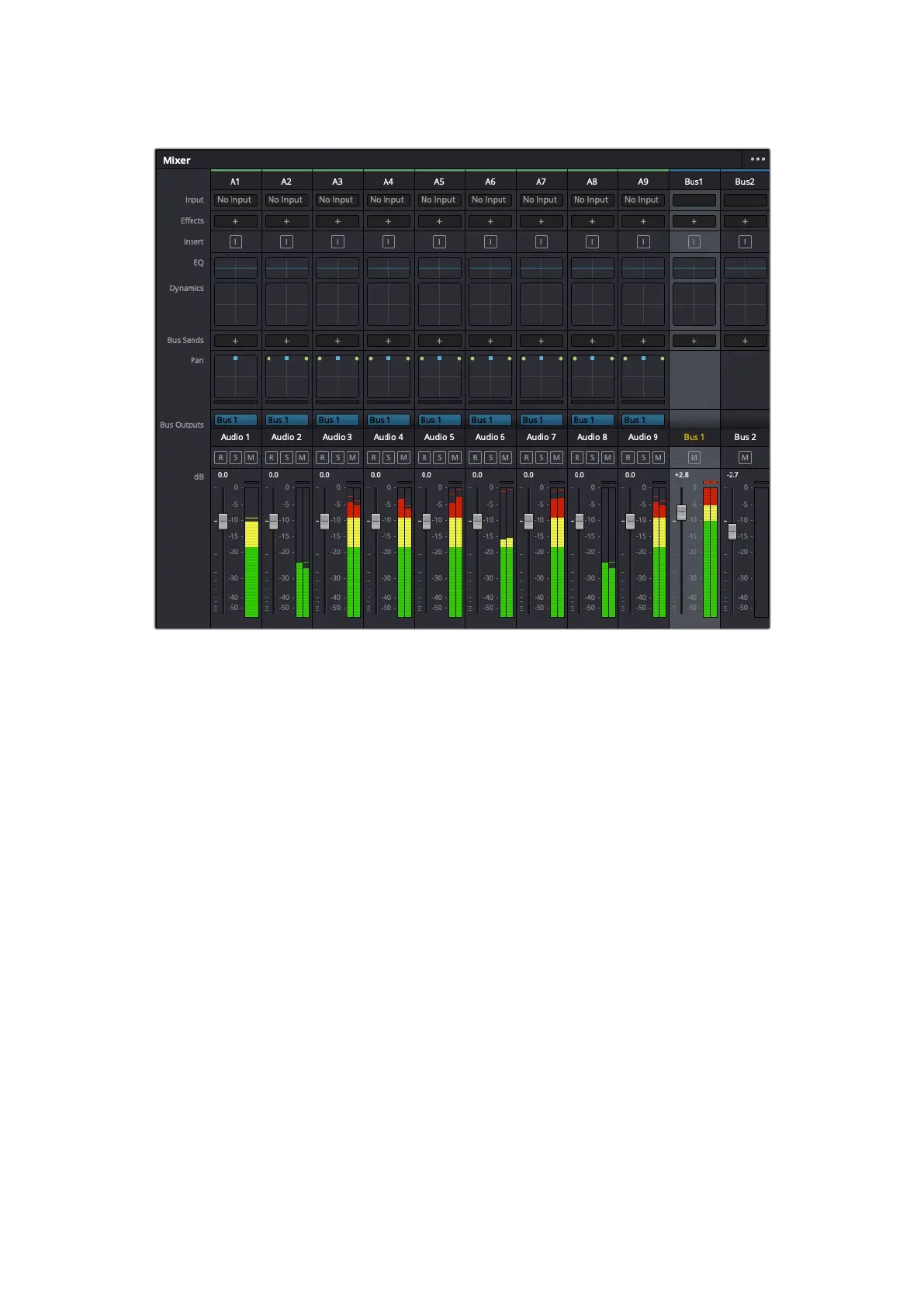 The audio mixer, with channel strips corresponding to the tracks in the timeline