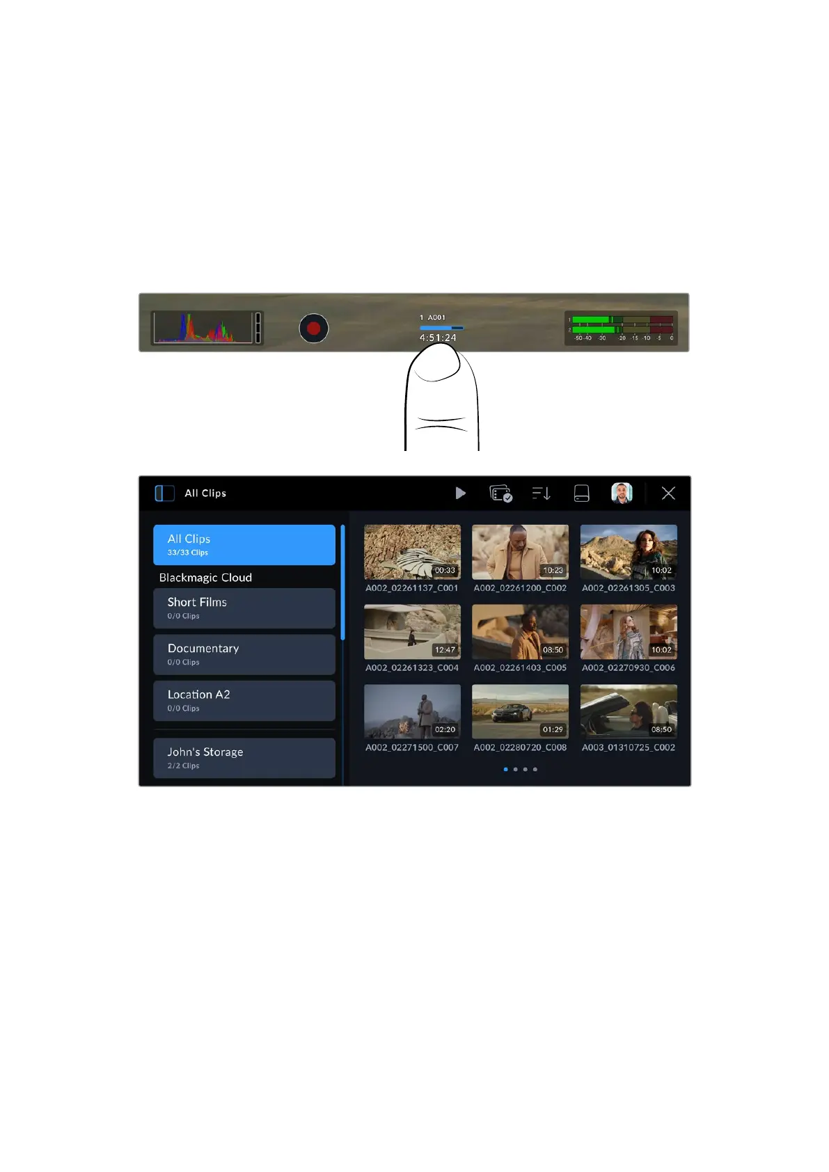 recorded clips using a browser interface. You can also delete clips and sync clips to Blackmagic