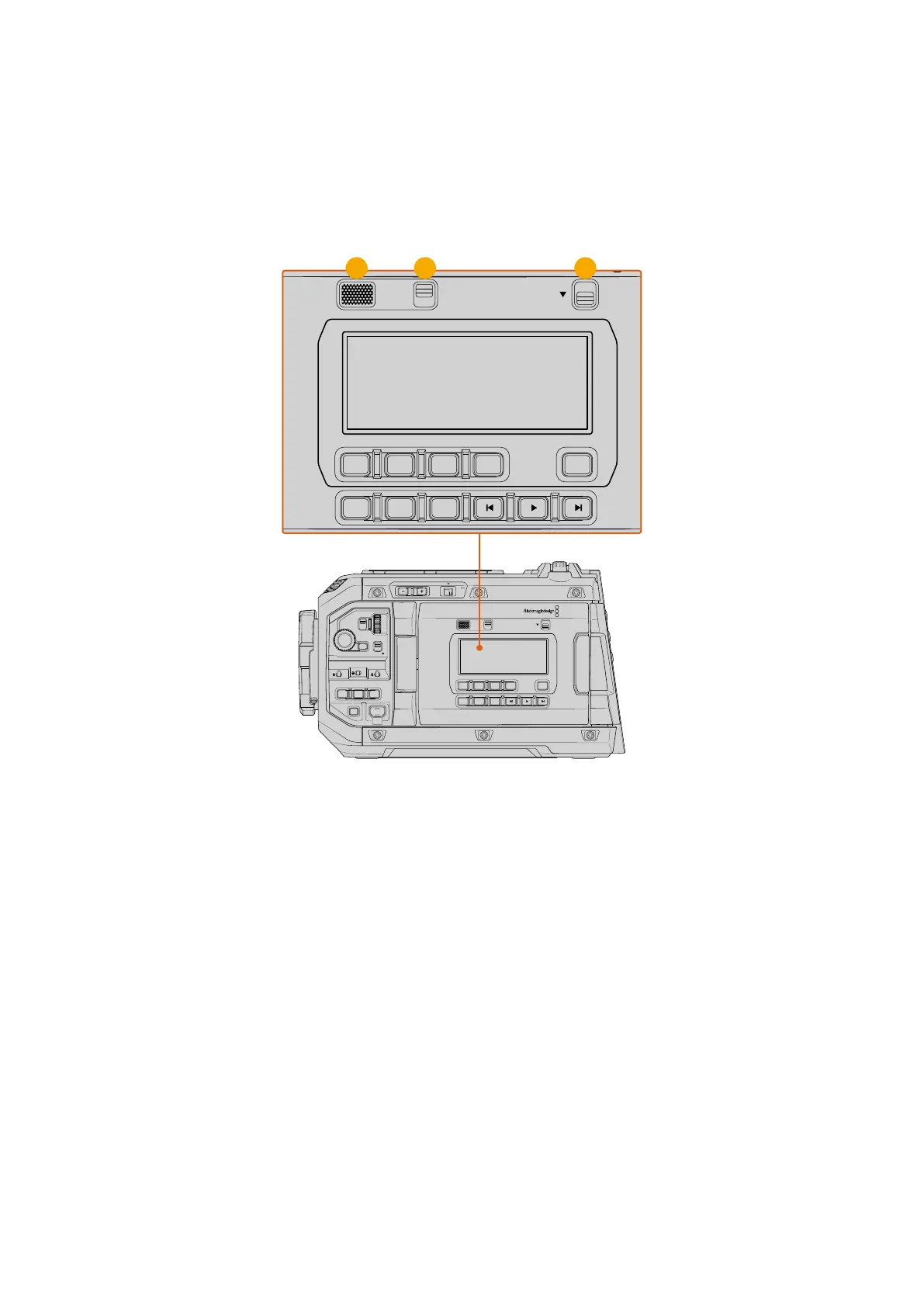 On the outside of your URSA Cine’s touchscreen monitor, you’ll find an LCD status monitor and