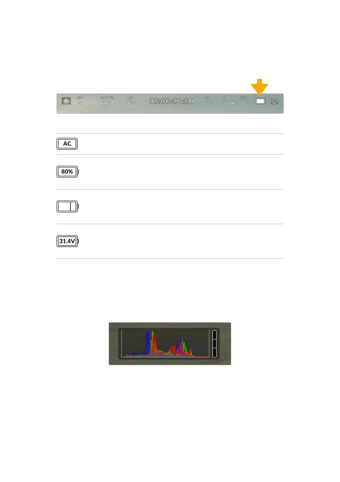 Your URSA Cine’s power status is displayed in the top right of the LCD screen. There are five