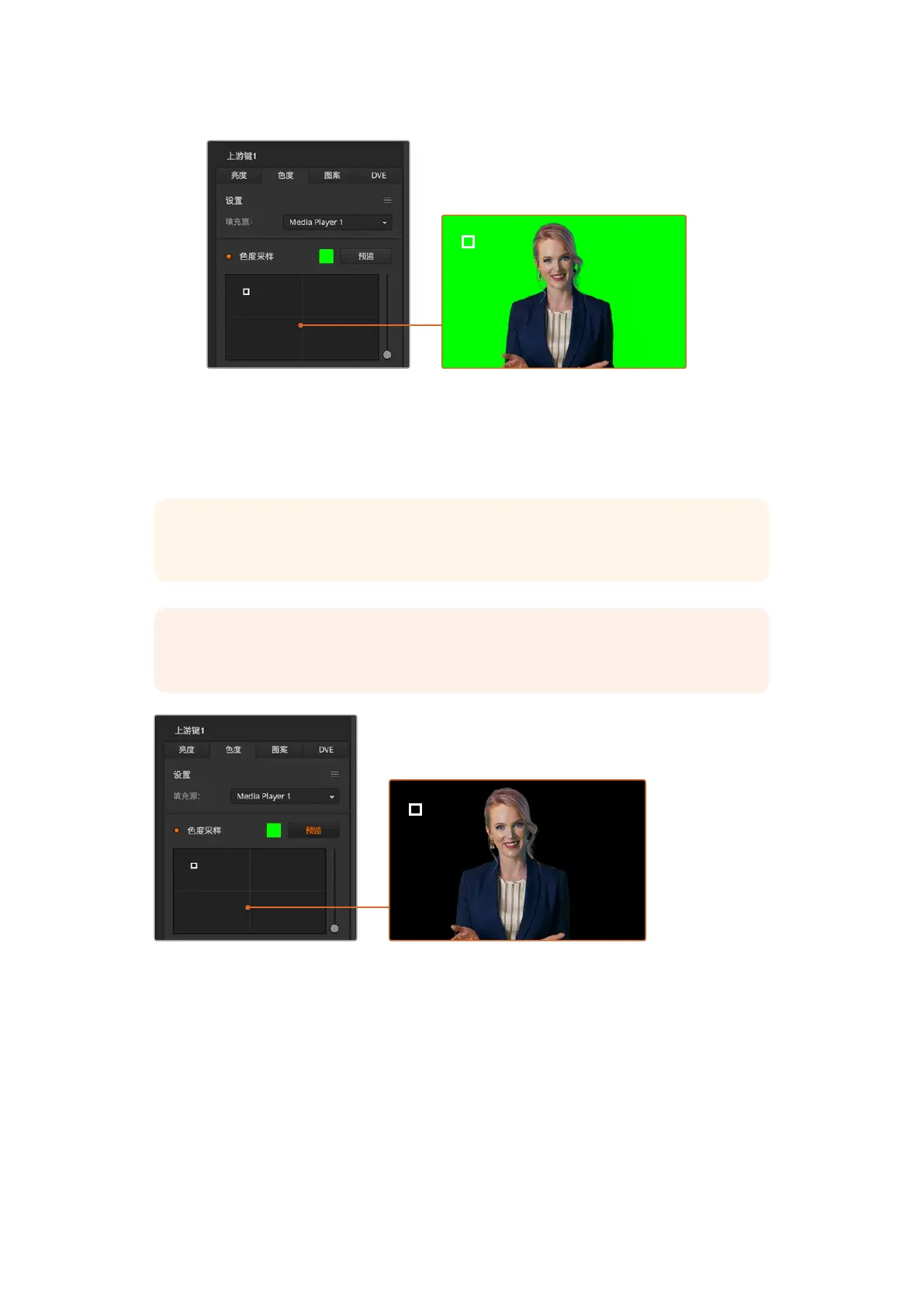 备注 点击色度采样面板上方的“预监”按钮可在任意时刻通过HDMI在预监输出上预监您的键