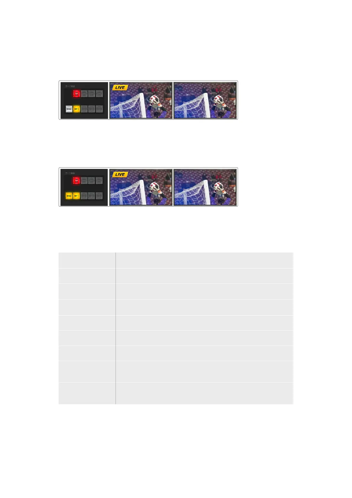 在本例中,该键处于直播状态,正如软件控制面板上亮起的ON AIR下一个转场按钮所提示的状态。BKGD