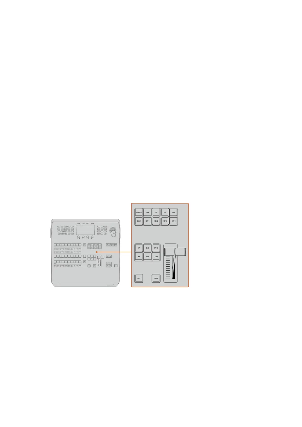 即使选定了转场类型,CUT按钮都可跳过该转场在Program( 节 目 )和 Preview( 预 监 )输 出 之 间 快 速 转 场 。