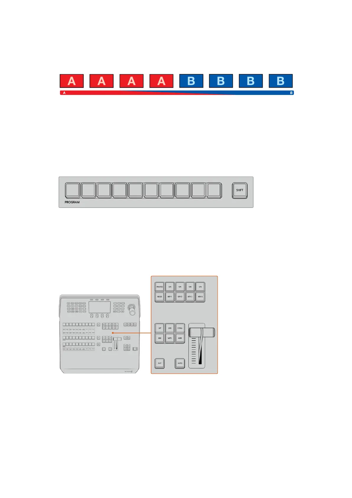 按钮执行硬切转场时,所有被选为下一个转场的上游键以及所有锁定到转场控制的下游键的播