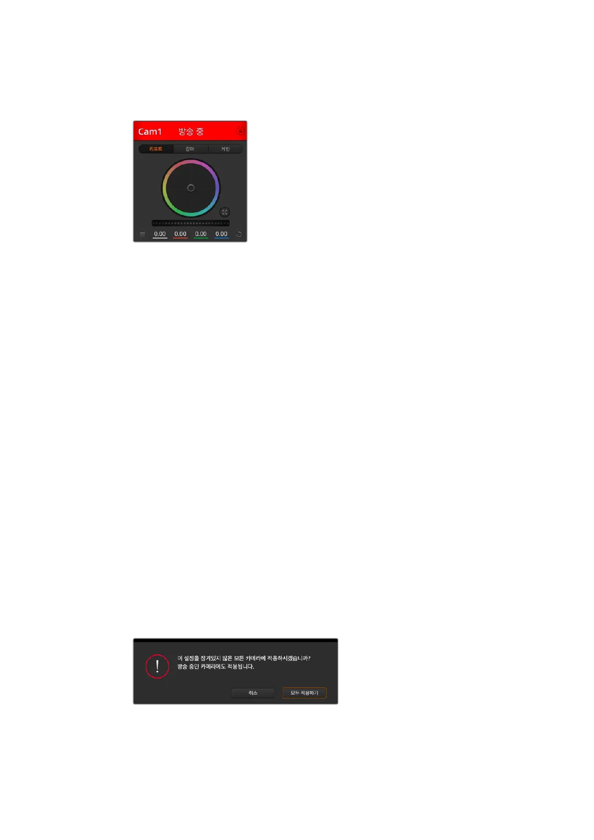 아니라 색대비, 채도, 색조, 휘도 혼합 설정을 초기화합니다. 색보정 설정을 각 카메라 제어장치에