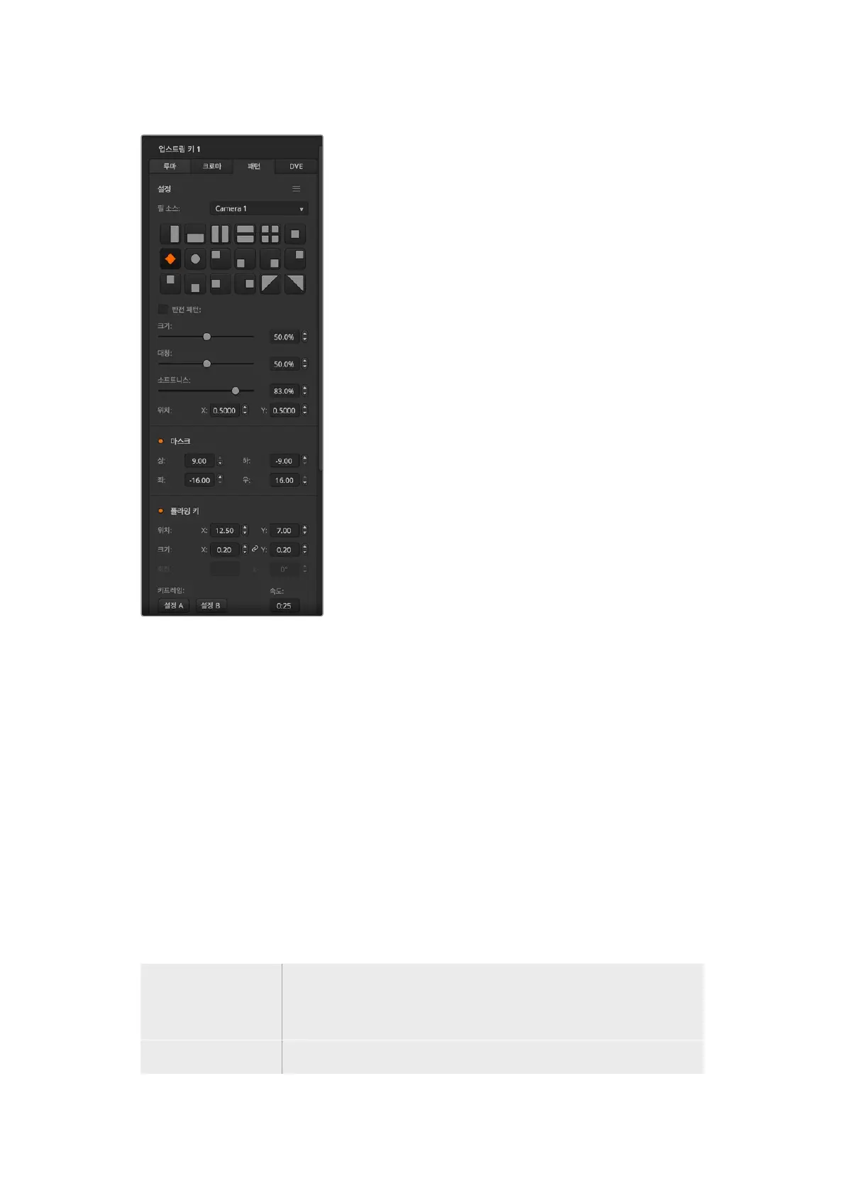 ATEM Software Control에서 키 패턴 선택 등의 패턴 설정을 조정할 수 있습니다.