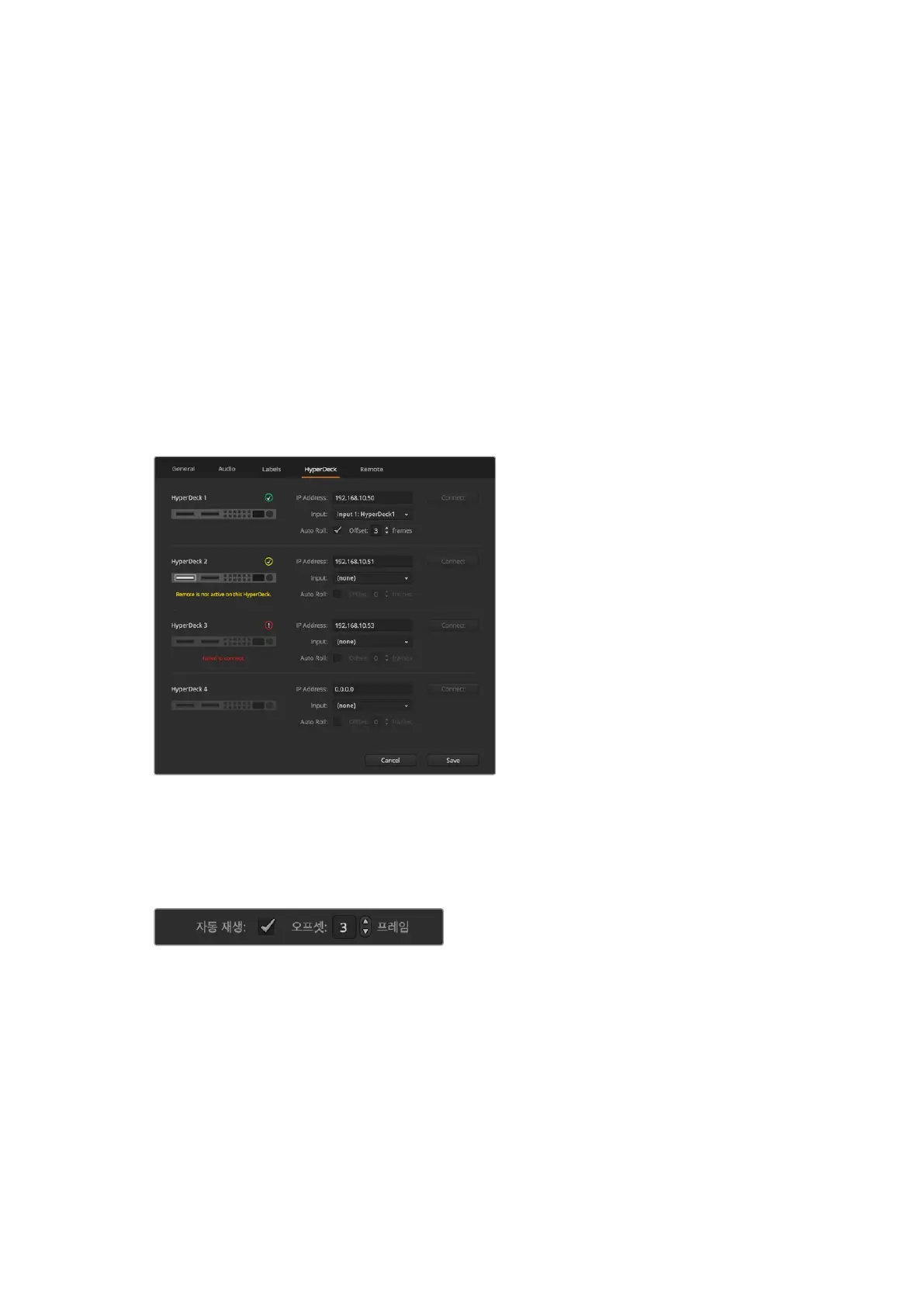 HyperDeck 연결 설정은 ATEM Software Control 설정의 ‘HyperDeck’ 탭에서 사용할 수 있습니다. 이