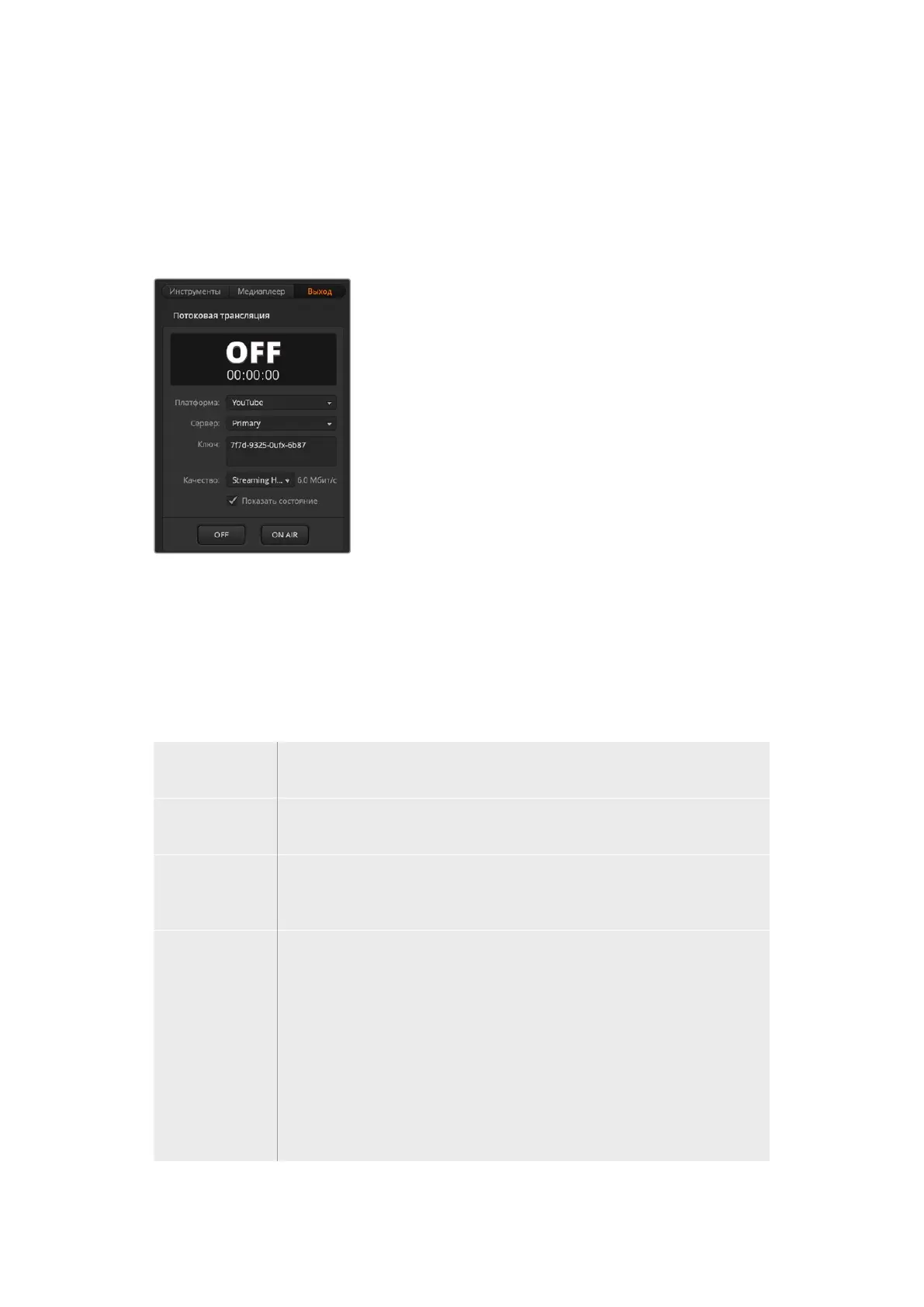 платформы. После этого для включения вещания достаточно нажать кнопку ON AIR, для