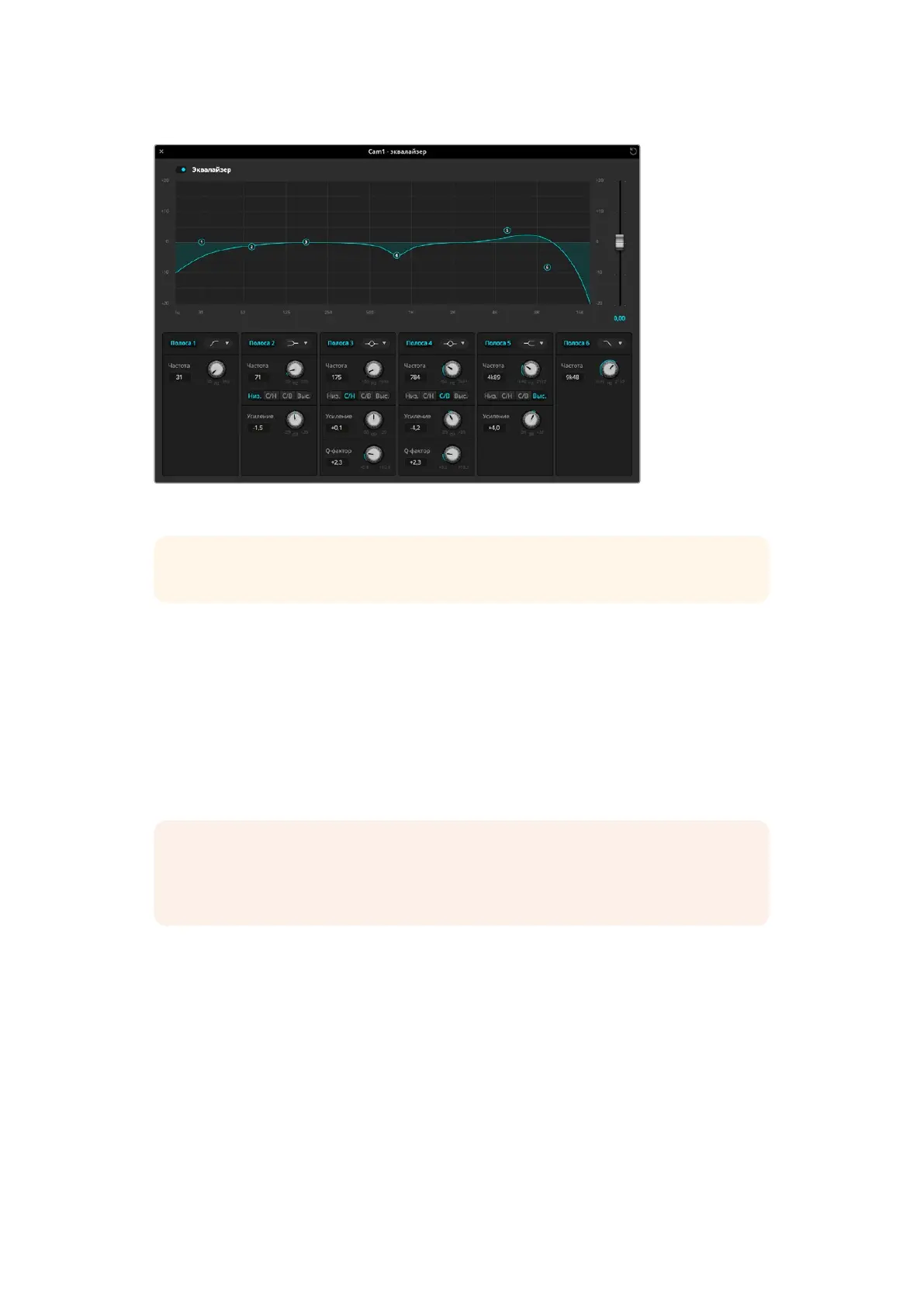 Каждый аудиовход имеет собственный шестиполосный параметрический эквалайзер