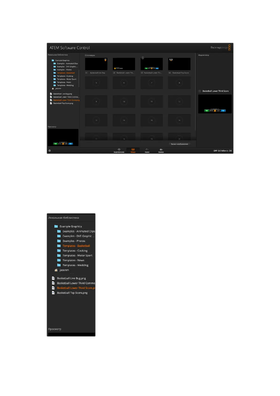 Ниже описан порядок работы со страницей «Медиа» в приложении ATEM Software Control.
