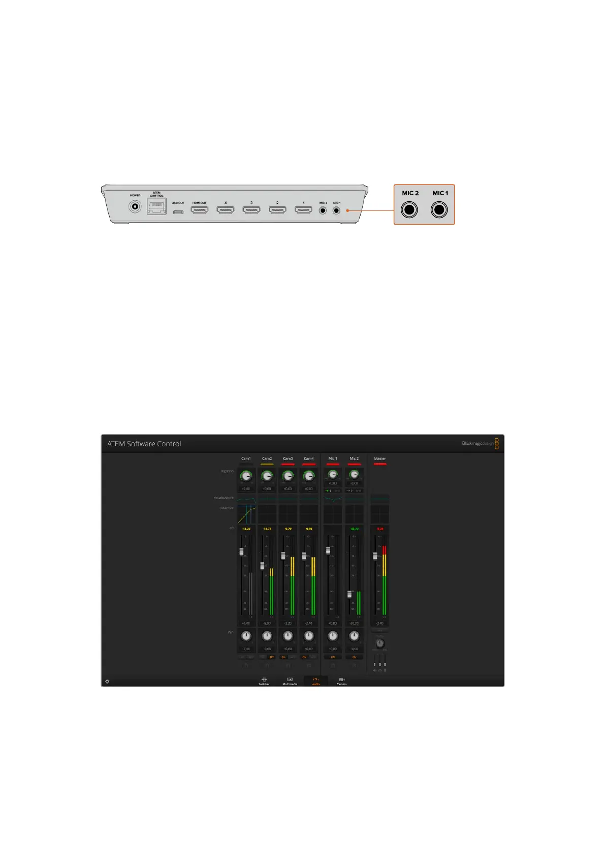 L’audio si può mixare usando i controlli sul pannello di ATEM Mini o della pagina Audio di