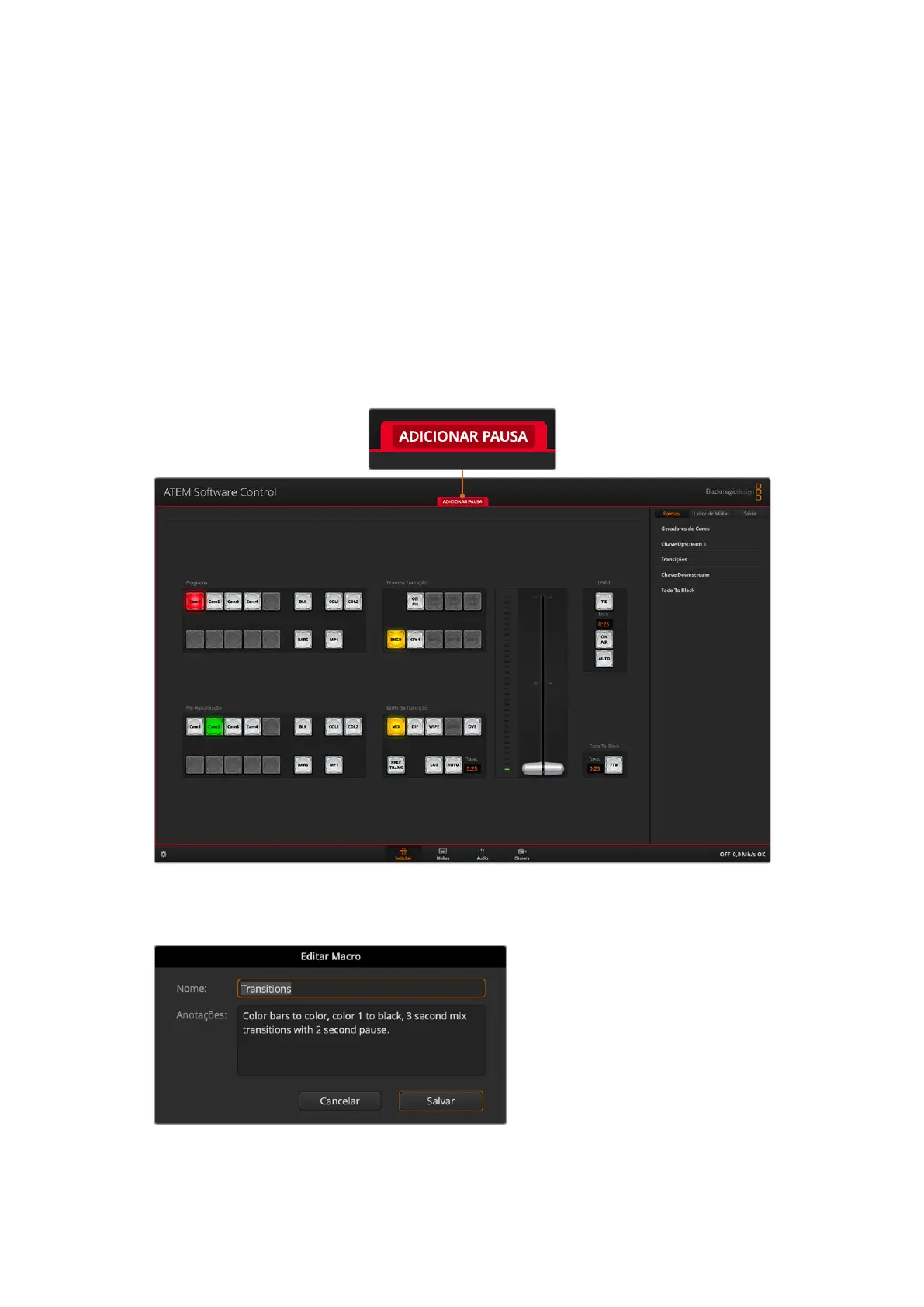 Se o macro foi gravado corretamente, o switcher realizará uma mesclagem de 3 segundos entre
