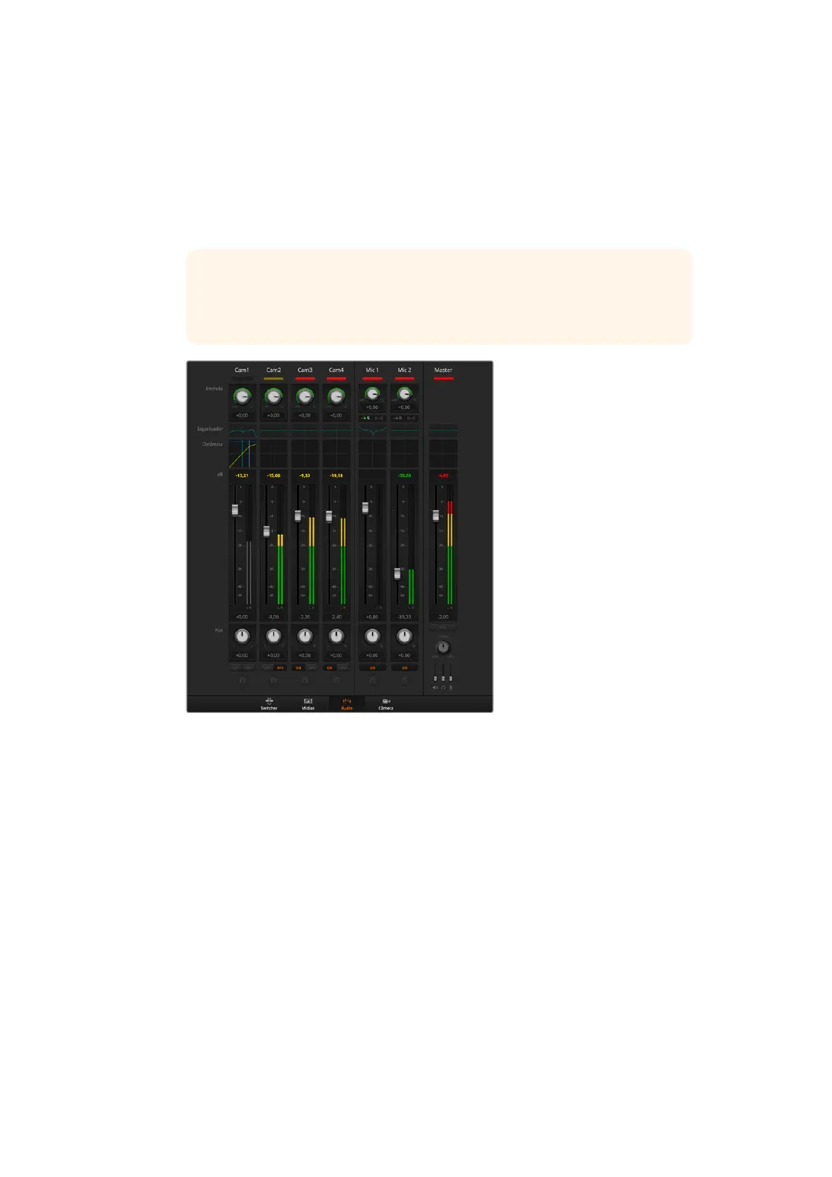 ATEM. Sempre consulte os níveis do mixer de áudio ATEM para as escalas
