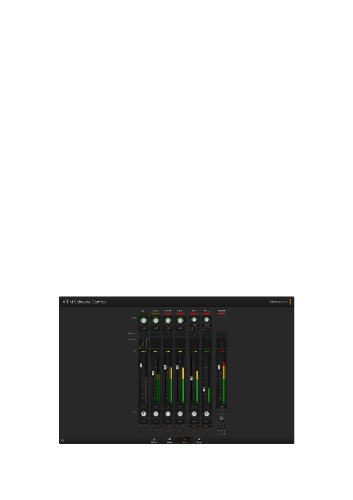 ATEM Software Control’deki ‘ses’ sekmesi, ATEM switcher’inizi kontrol ederken aktif hale gelen,