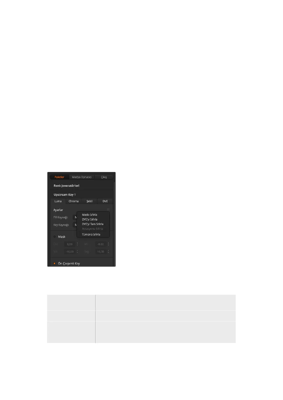 Luma ve linear key’ler aynı parametreleri kullandıkları için, ‘luma key menu’ isimli ortak bir menü