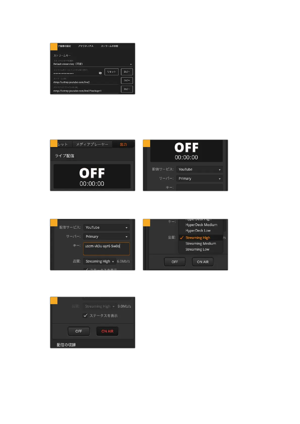 次に、コピーした配信用のストリームキーを、ATEM Software Controlの 配 信 の「 キ ー:」に ペ ー ス ト し ま す 。