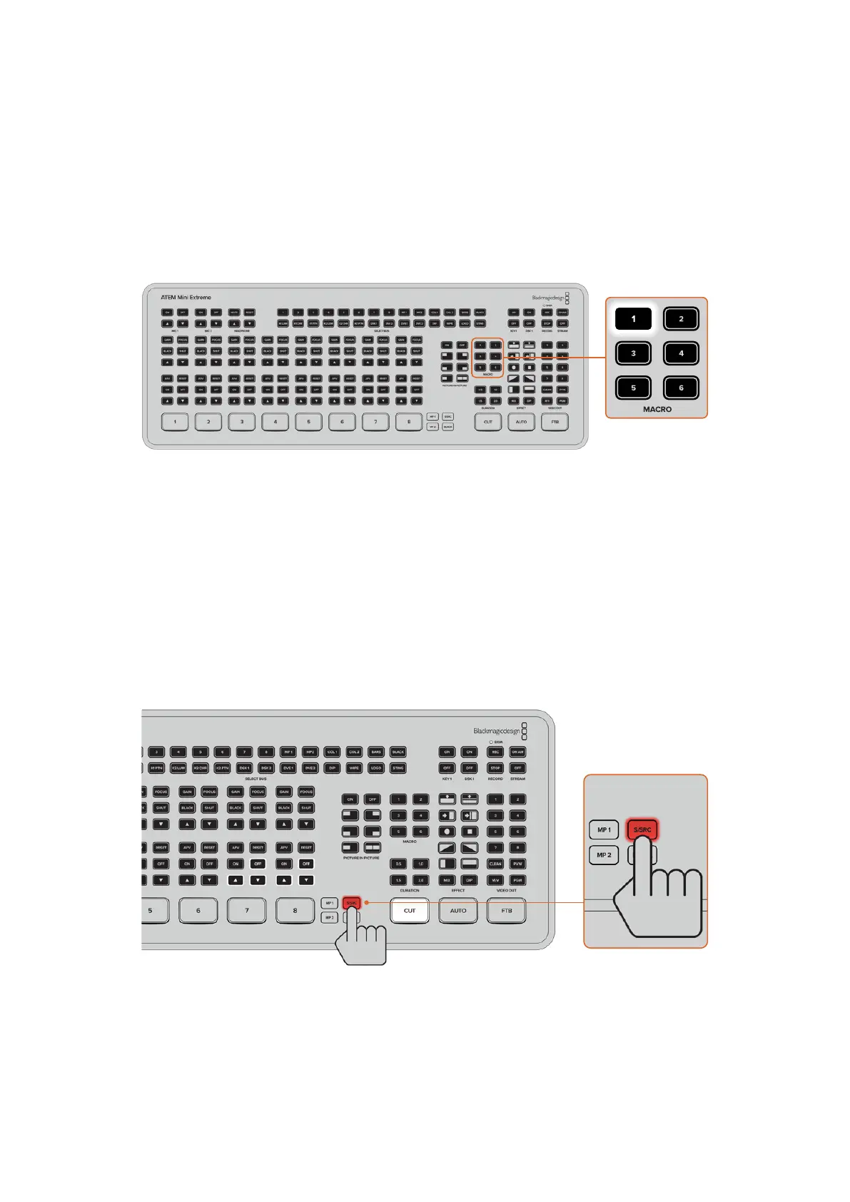 スイッチャー本体 で、番号の 付いたマクロボタンを押すと、マクロが 直ちに起 動します。マクロはまた、追