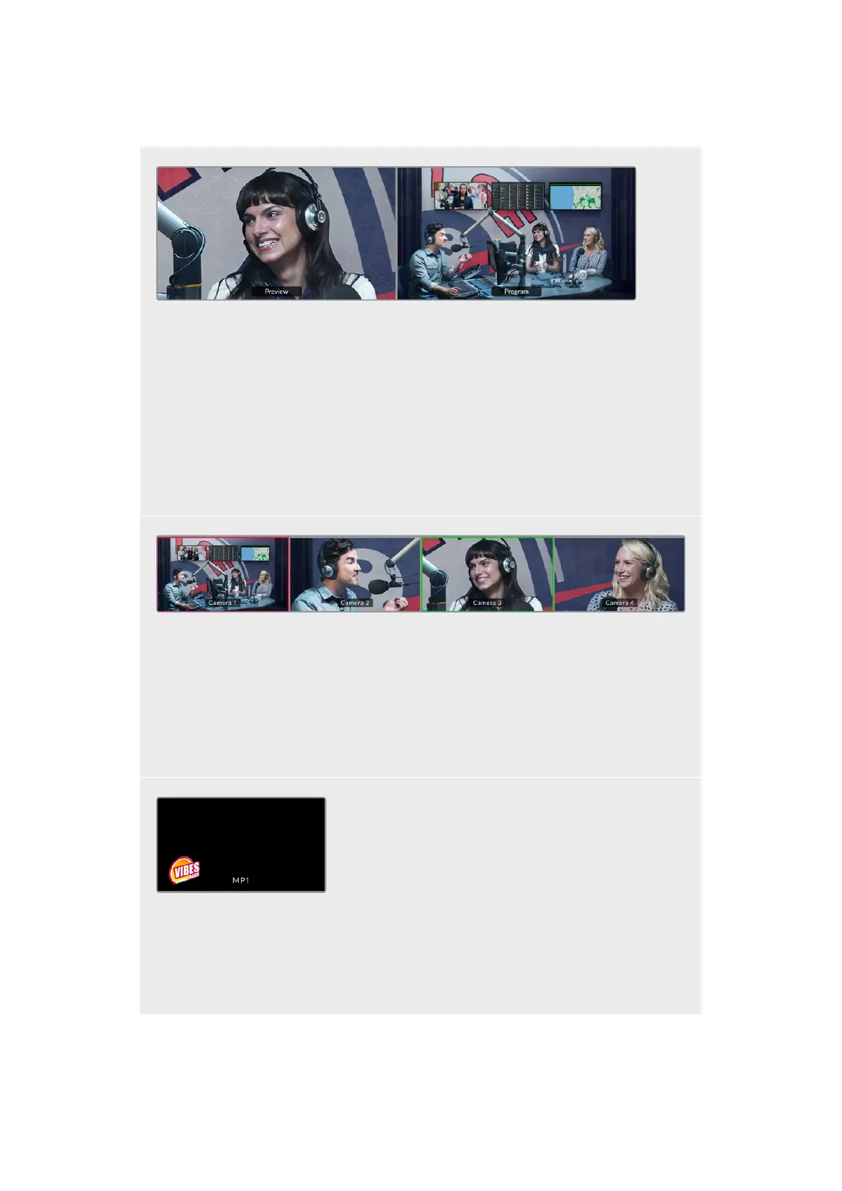 入 力が プレビュー/プログラム出力に送 信されると、それぞ れのビューの周 囲 に 緑 /赤 のタリーボーダ