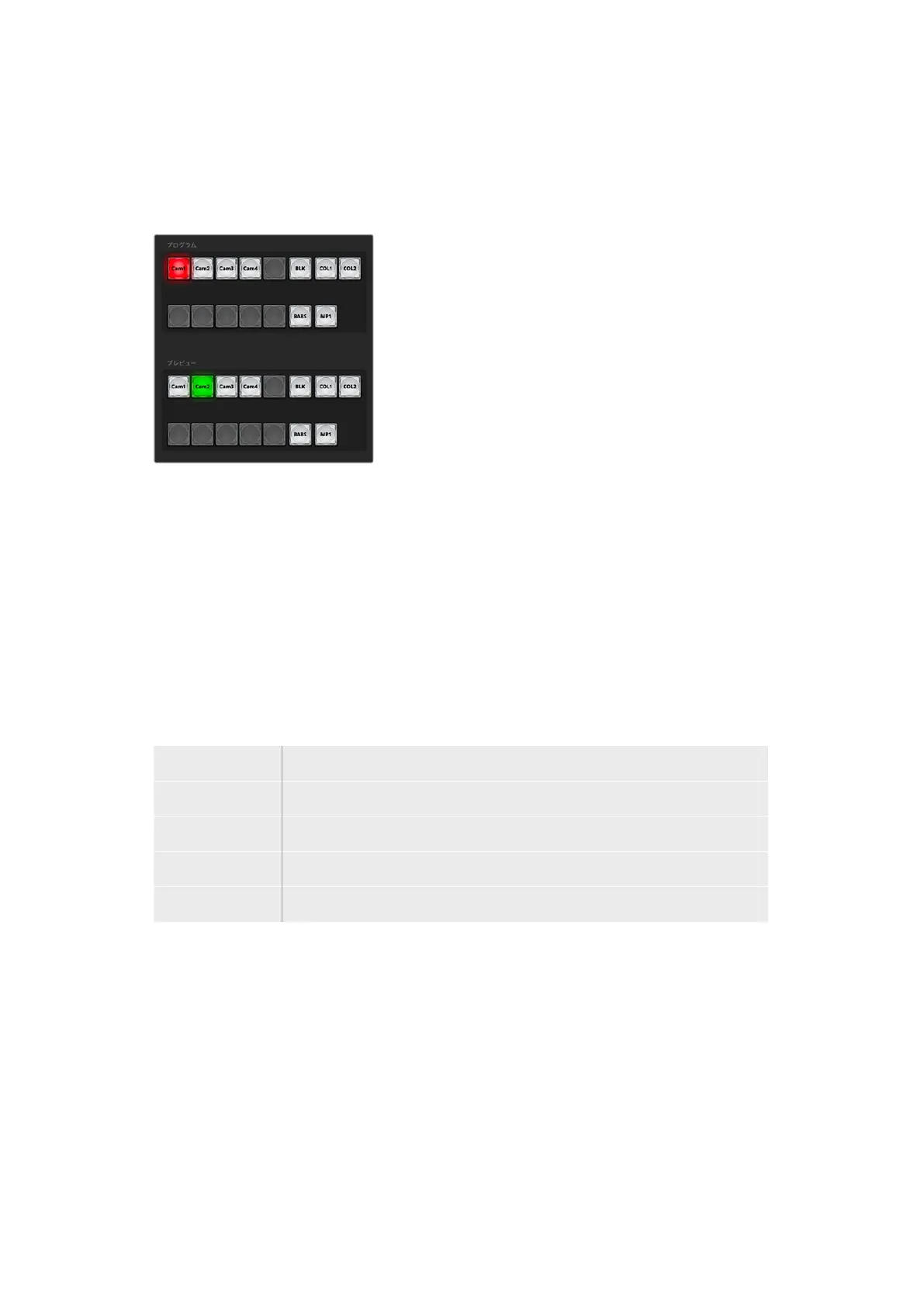 プログラム/プレビュー切り替えモードでは、プレビューバスのソース選択ボタンは、プレビュー出力にバ