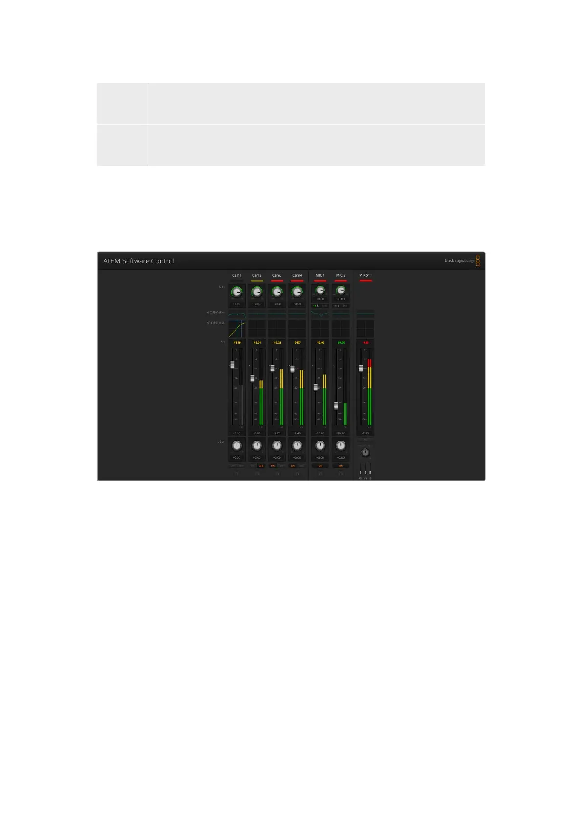 ATEM Miniは 、高 度 な Fairlightオーディオコントロールを搭載しており、各入力およびマスター出力のサ