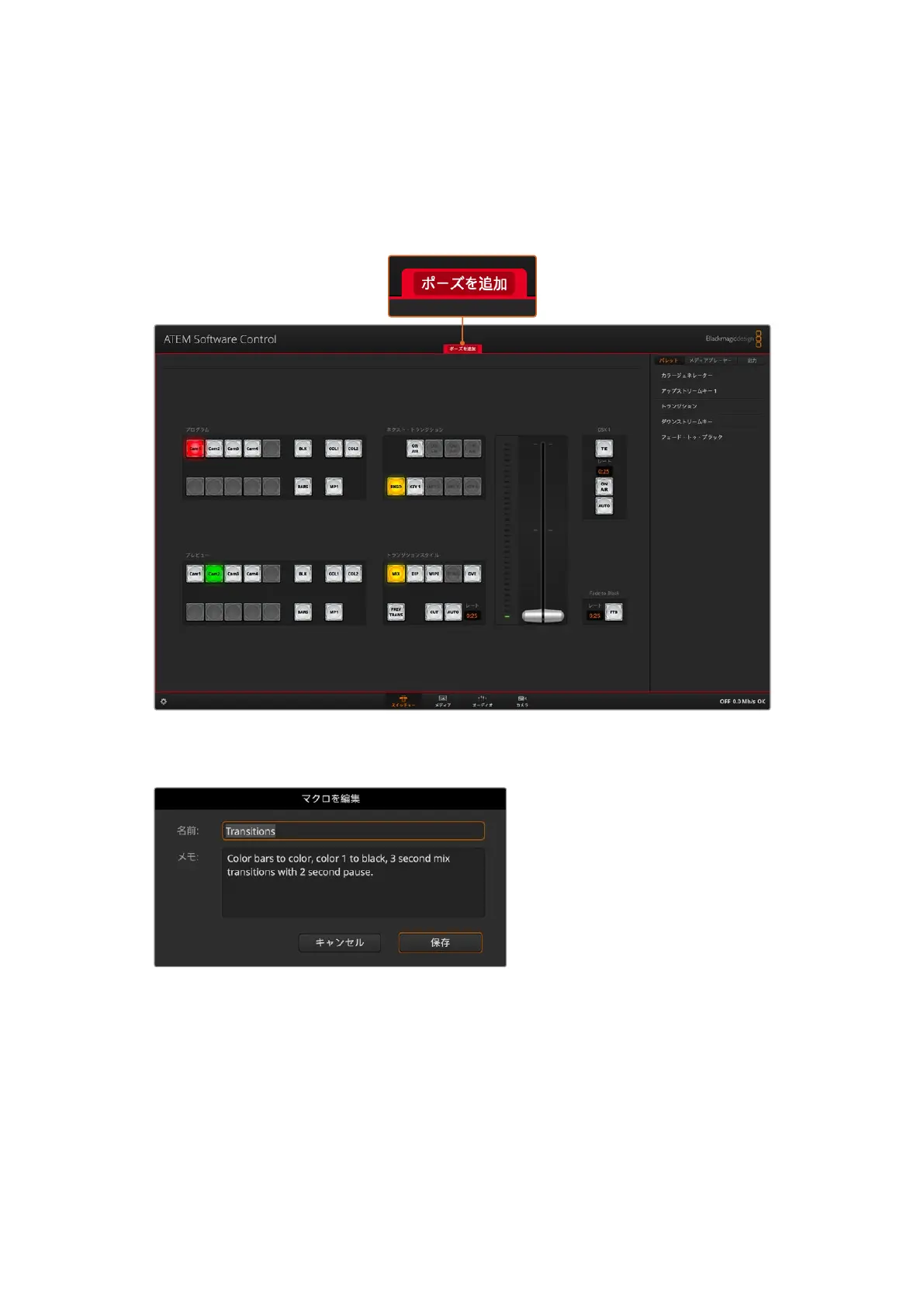 マクロが 正しく設 定されていれば 、マクロウィンドウの1つのボタンをクリックするだけ で、ATEMスイッチ ャ ー