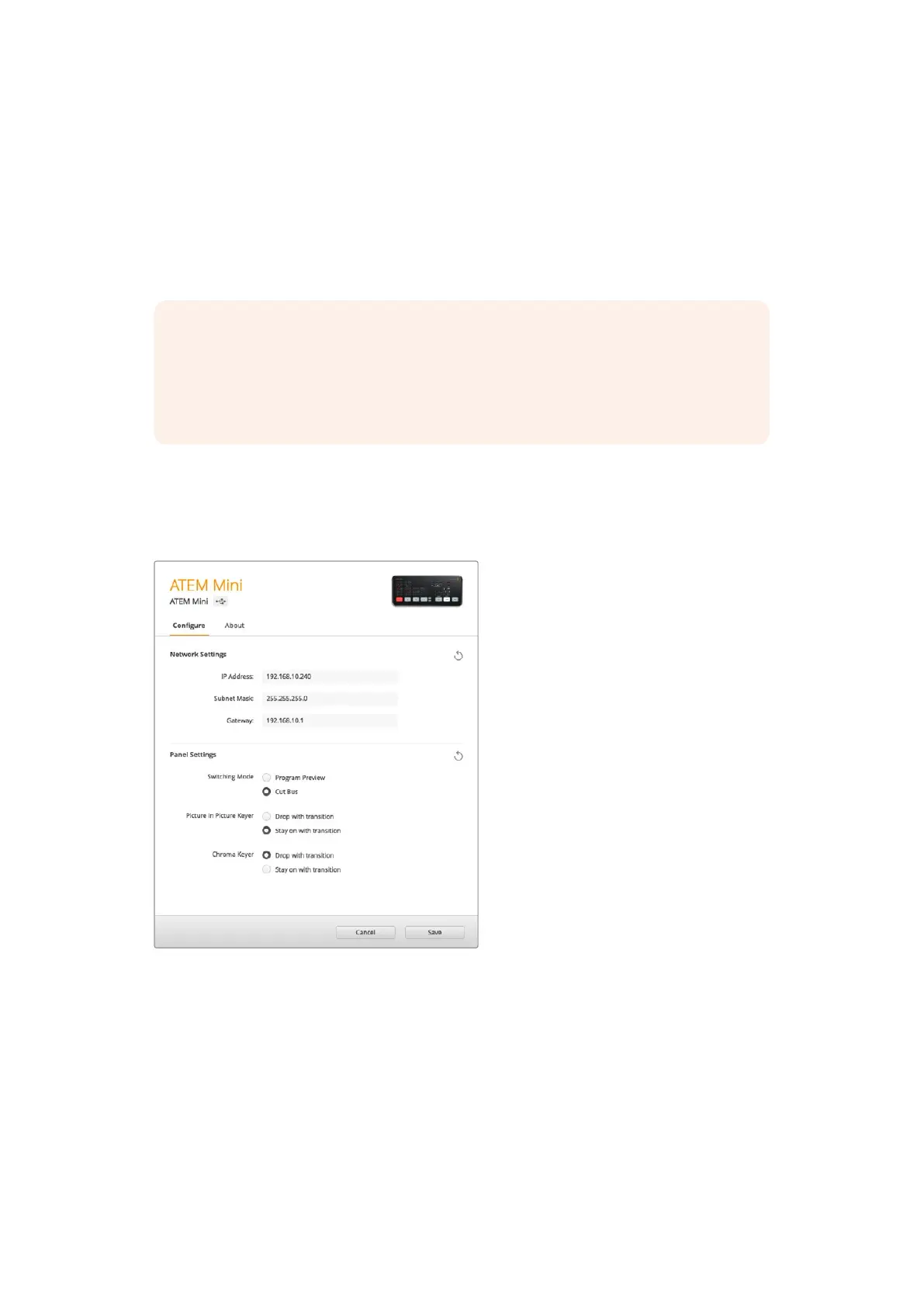 ATEM Miniの現在のIPアドレス、サブネットマスク、ゲートウェイ設 定が「Configure」ウ ィ ン ド ウ