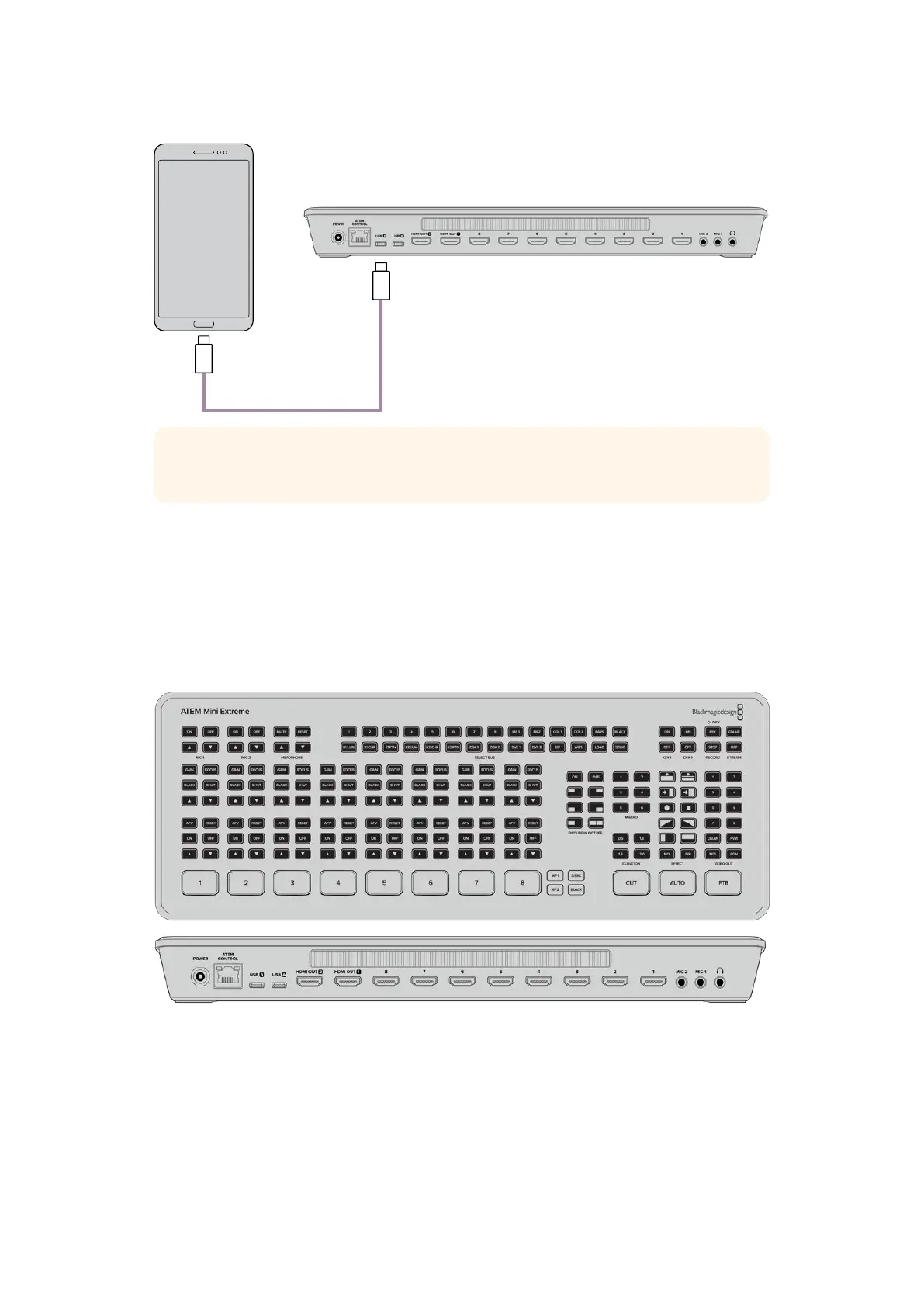 Sur l’ATEM Mini Extreme, vous pouvez connecter deux appareils USB-C simultanément. Ainsi, vous