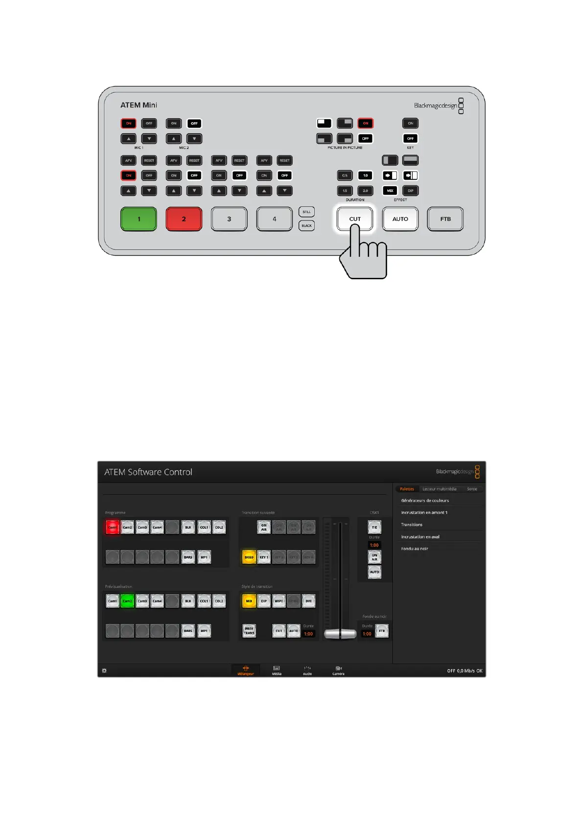 d’entrée puis sur le bouton Auto ou Cut pour commuter la source à l’antenne.