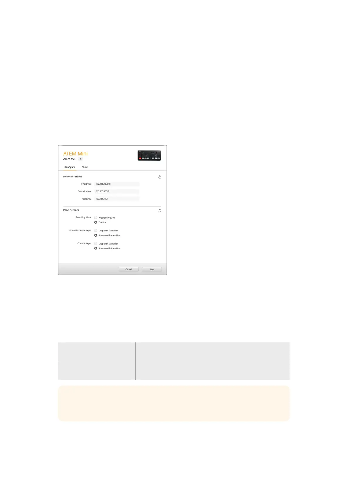 Ce paramètre vous permet de régler l’ATEM Mini sur le mode Programme/Prévisualisation (Program/