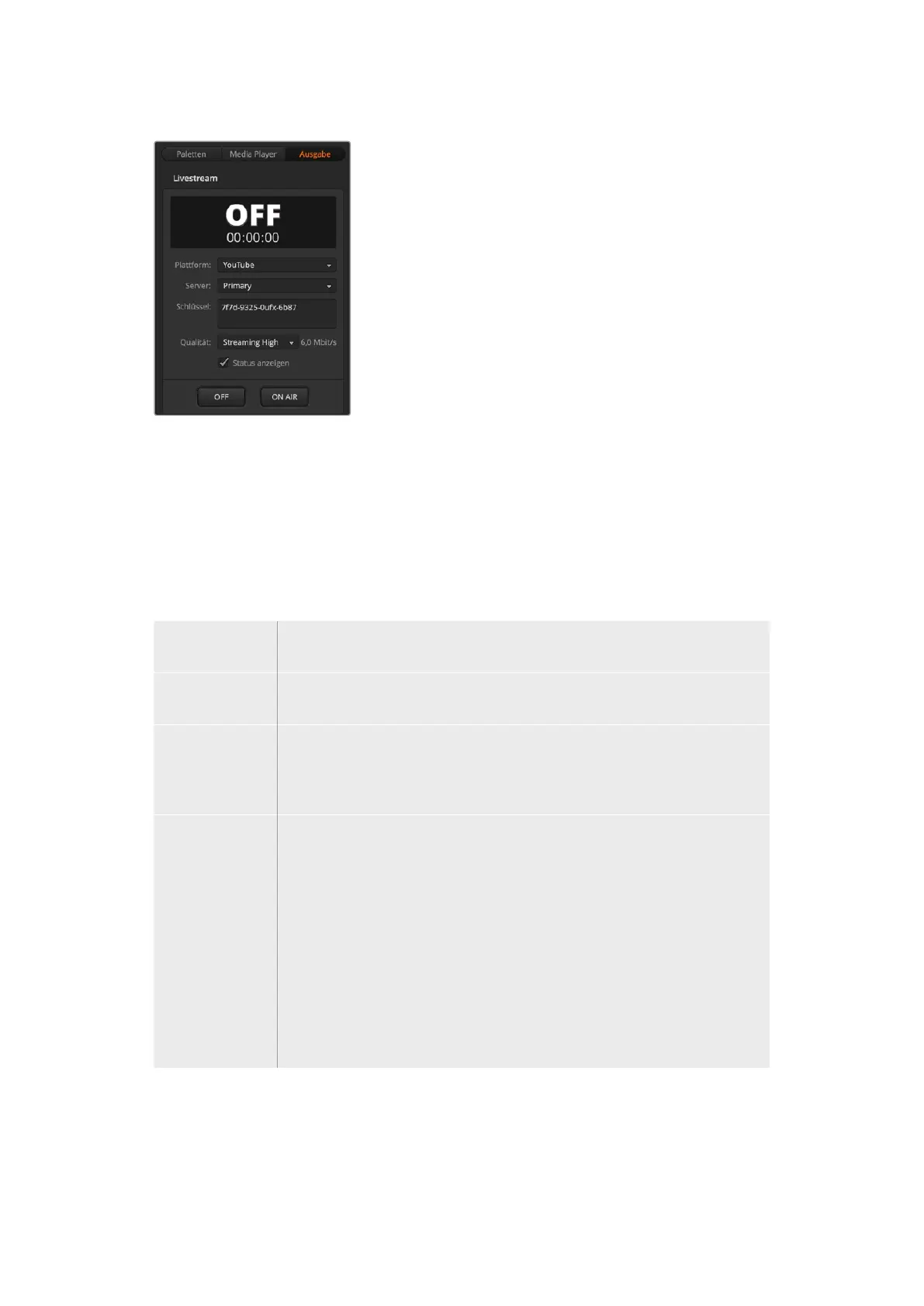 Schlüssel Geben Sie hier den Streamschlüssel ein, den die Streamingplattform Ihrer