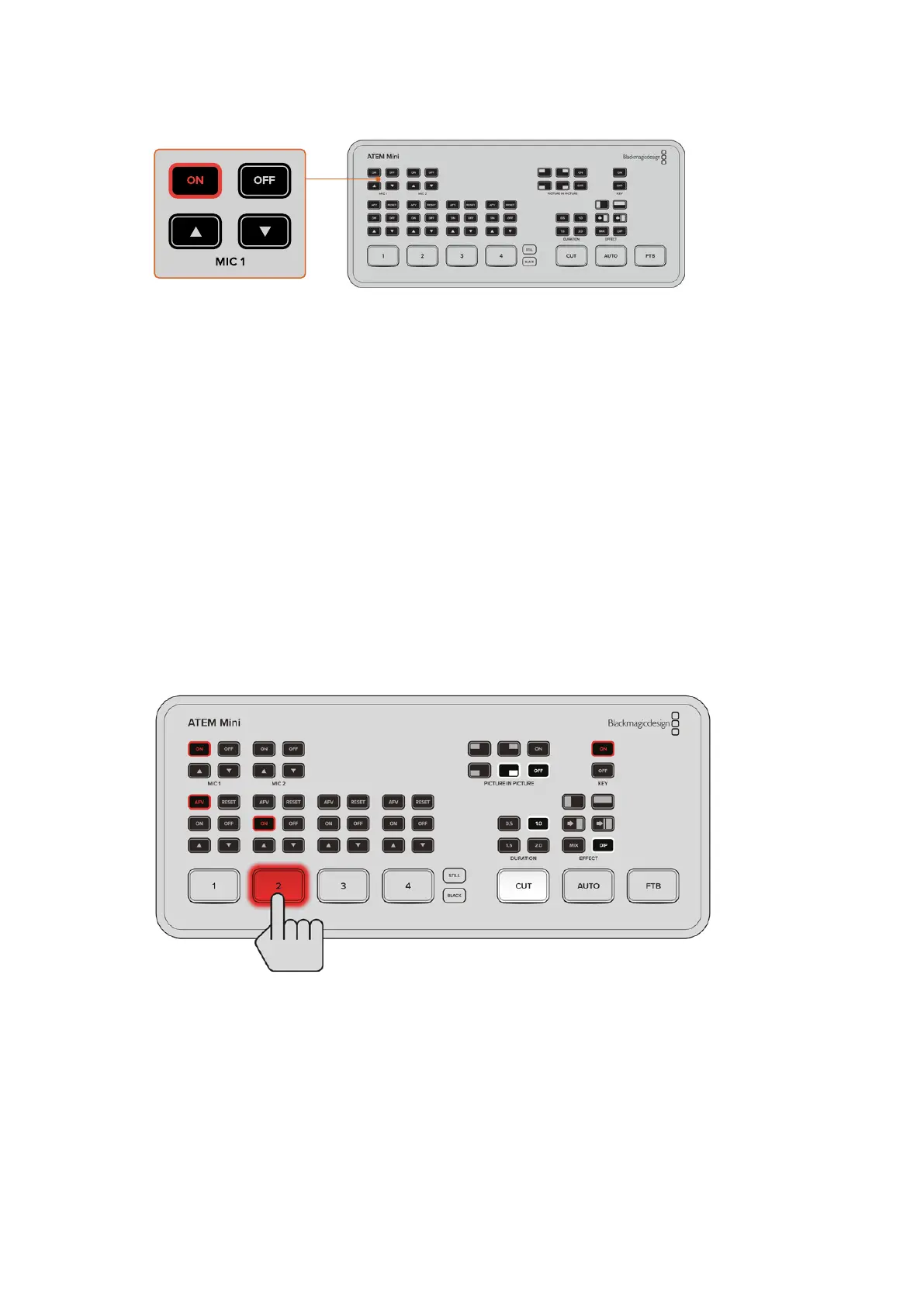 En el siguiente ejemplo, se realiza un corte entre la fuente 1 y la 2 en el mezclador ATEM Mini.