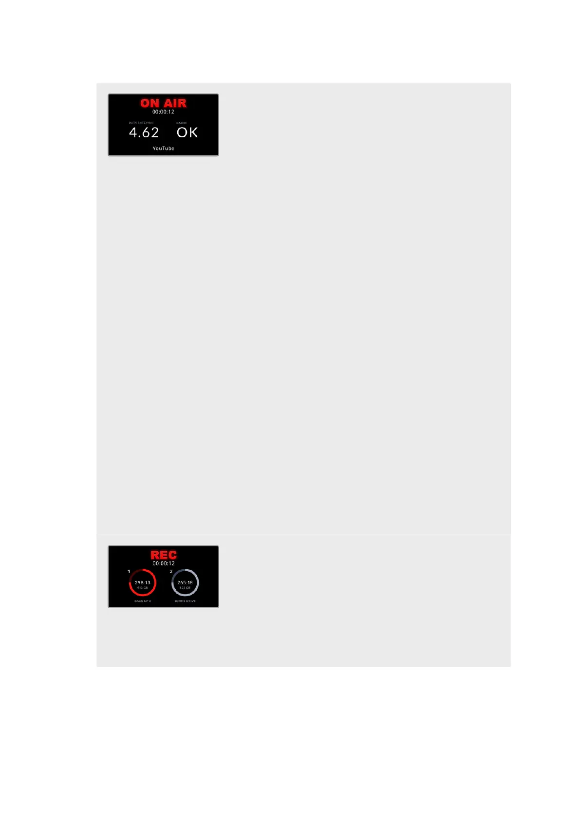 Si se está almacenando la transmisión en una unidad USB-C externa, esta ventana mostrará el estado