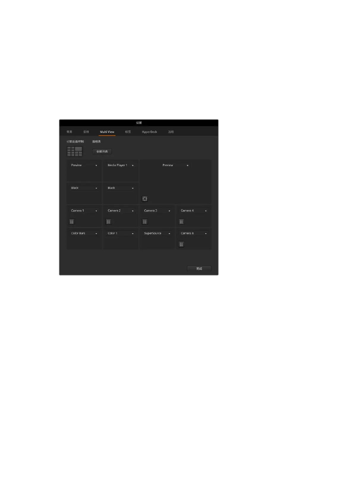 音频表全部开启或全部关闭。使用分割画面控制按钮来选择想要的布局。