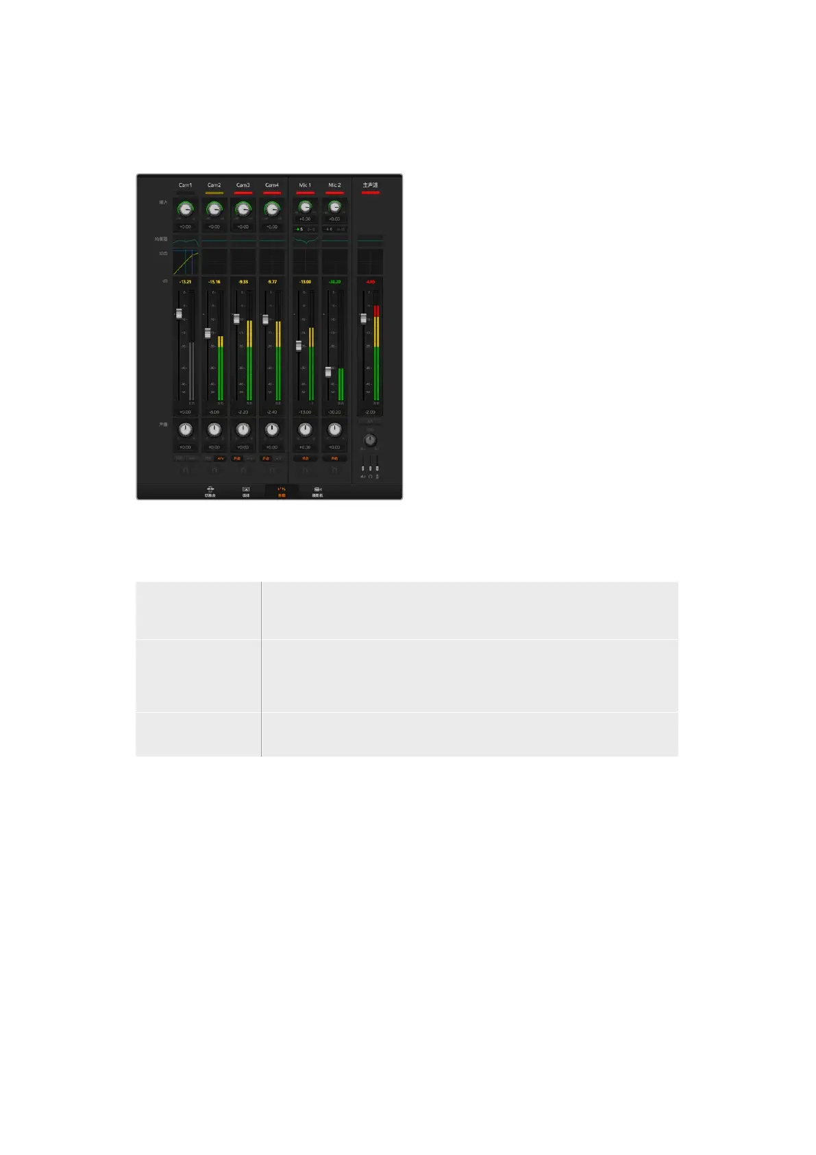 调音台右侧的主推子用于设置USB网络摄像头节目输出上的音频电平增益,并有其单独的音频电平表。在