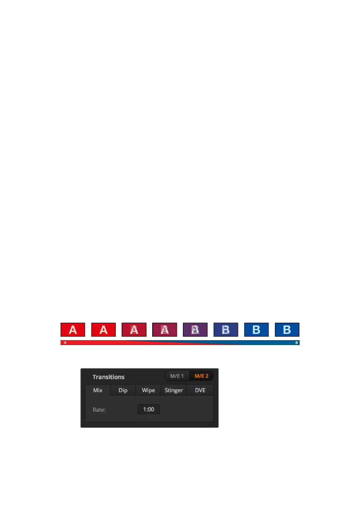 Mix, dip, wipe and DVE transitions allow you to transition between two background sources