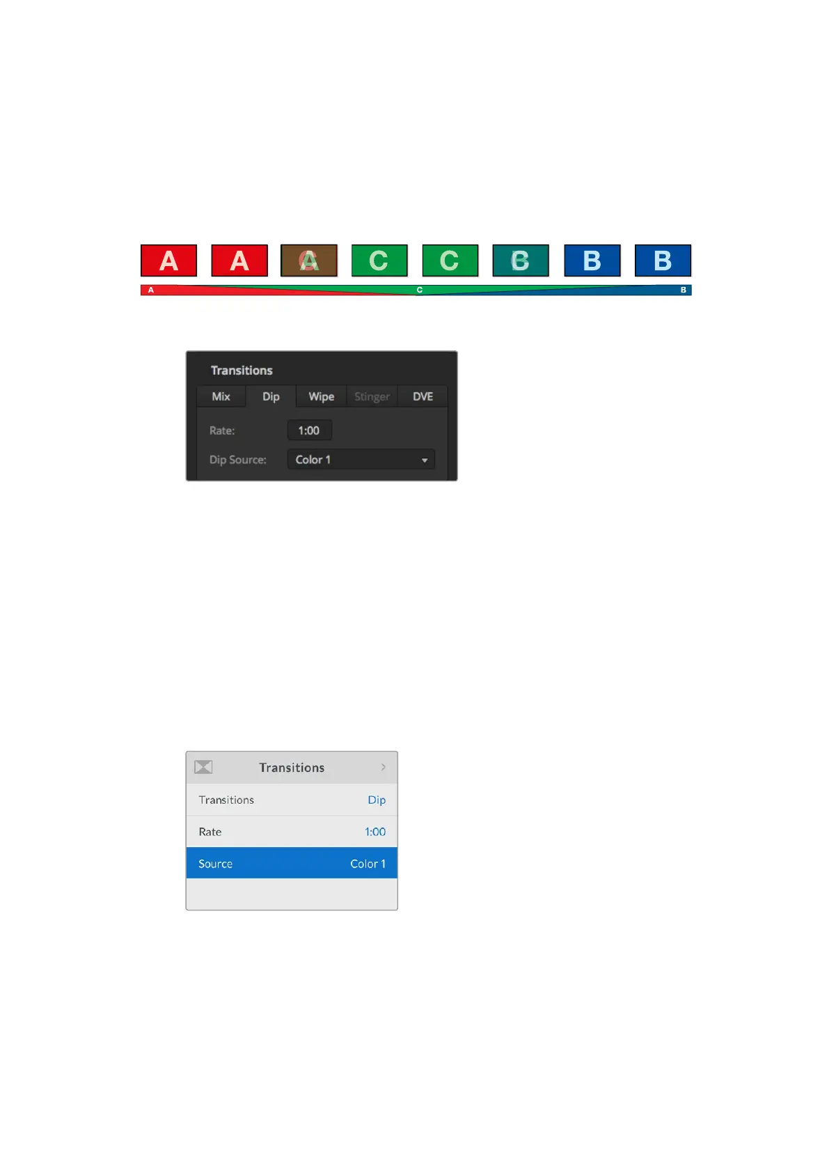 another. However, a dip transition gradually mixes through a third source, the dip source.