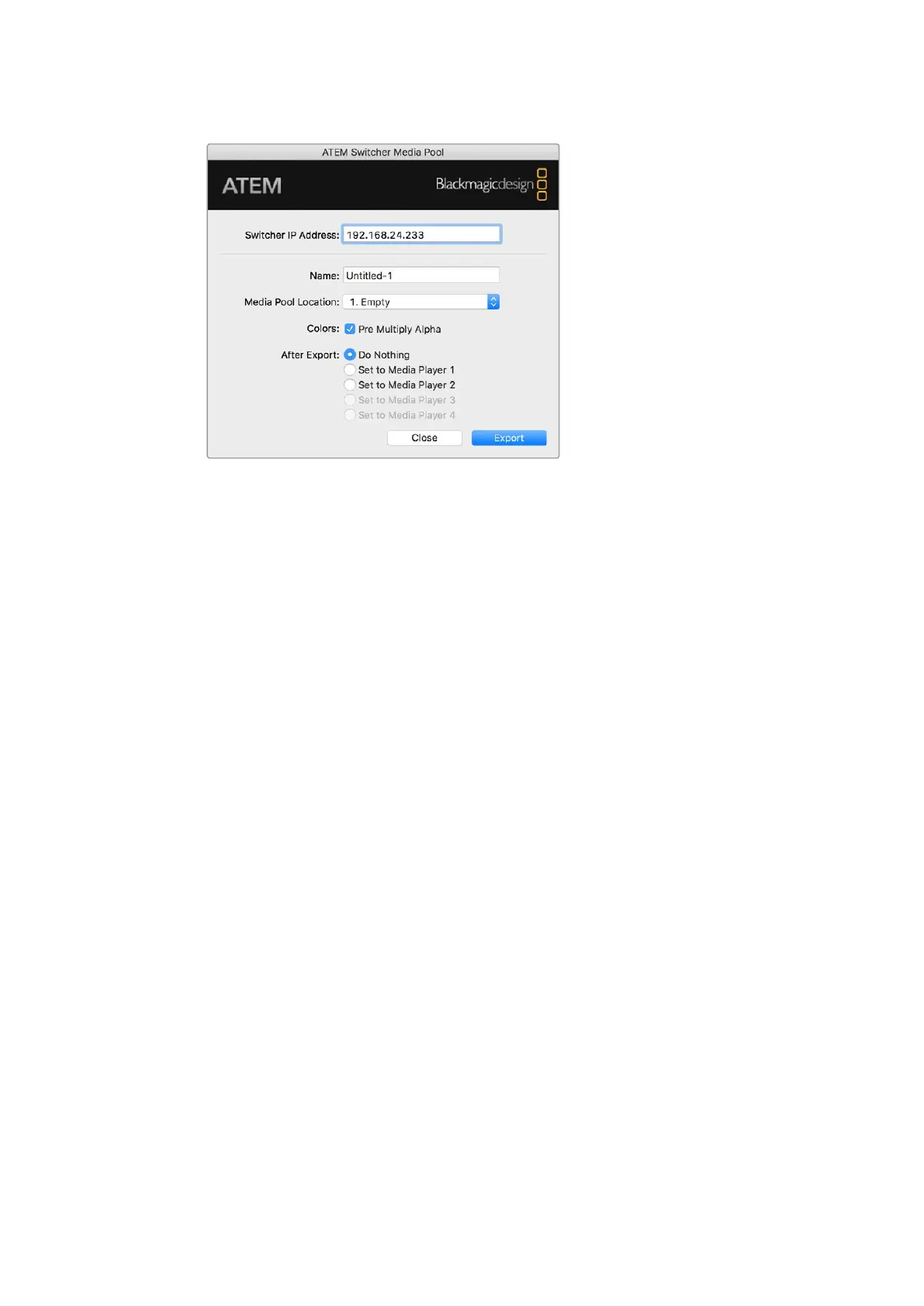 and then select ATEM Switcher Media Pool to export. A window will appear asking you to