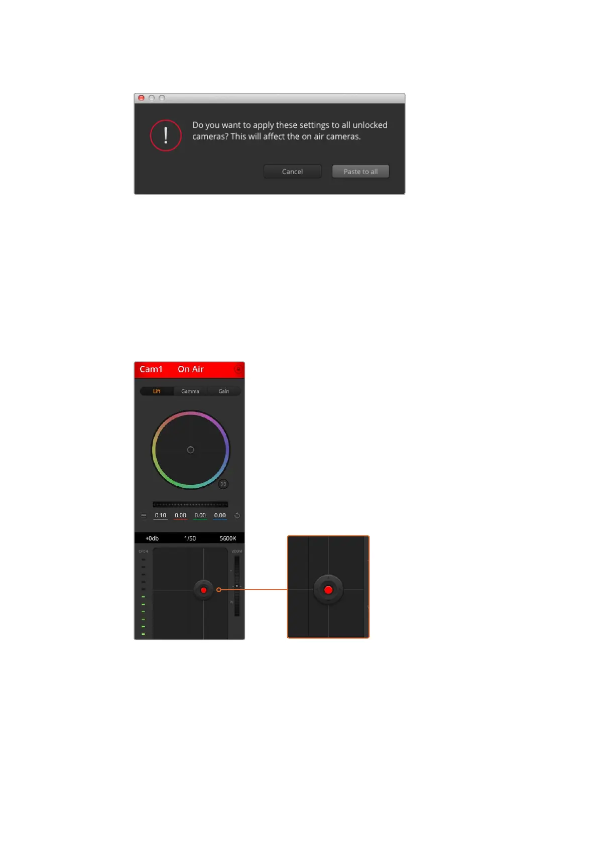 The iris/pedestal control illuminates red when its respective camera is on air.