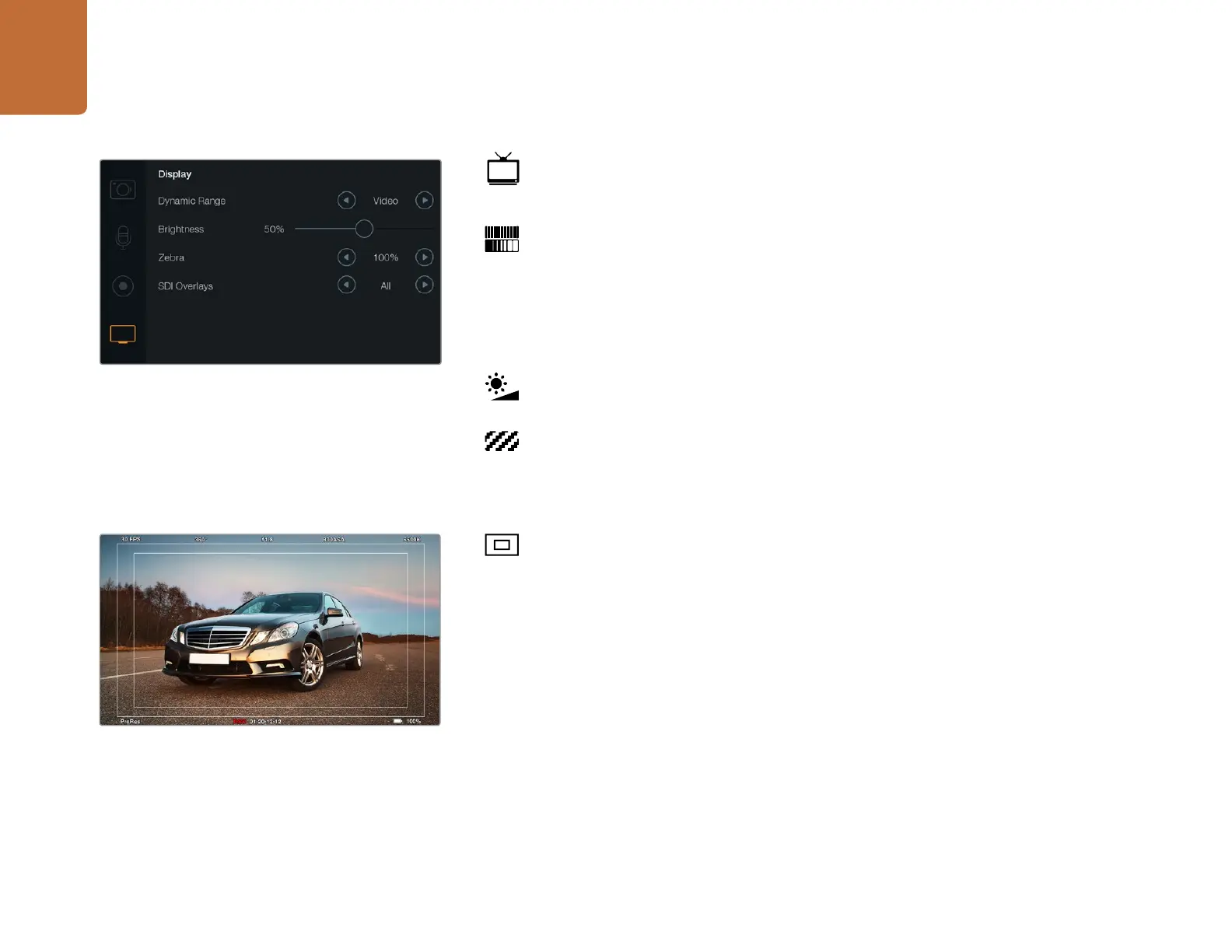 オーバーレイ設定は、 モニターにビデオの情報を表示します。 矢印アイコンで