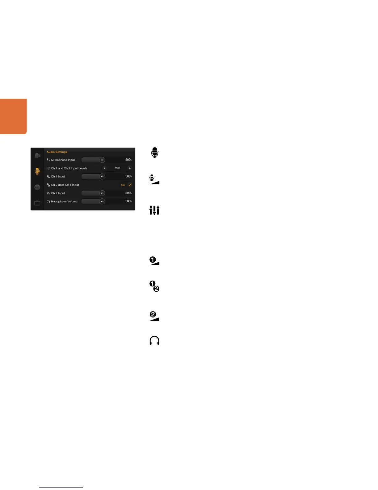 levels. The mono microphone input is recorded to audio channels 1 and 2 when no external audio