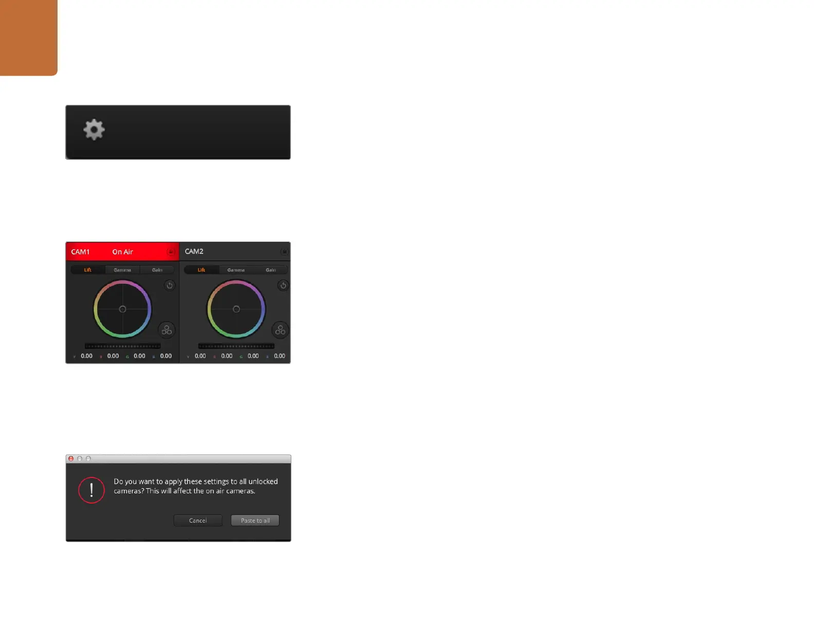 sind, oder das Farbkorrekturfenster geöffnet ist, können Sie über diese Schaltflächen die jeweils zu steuernde Kamera