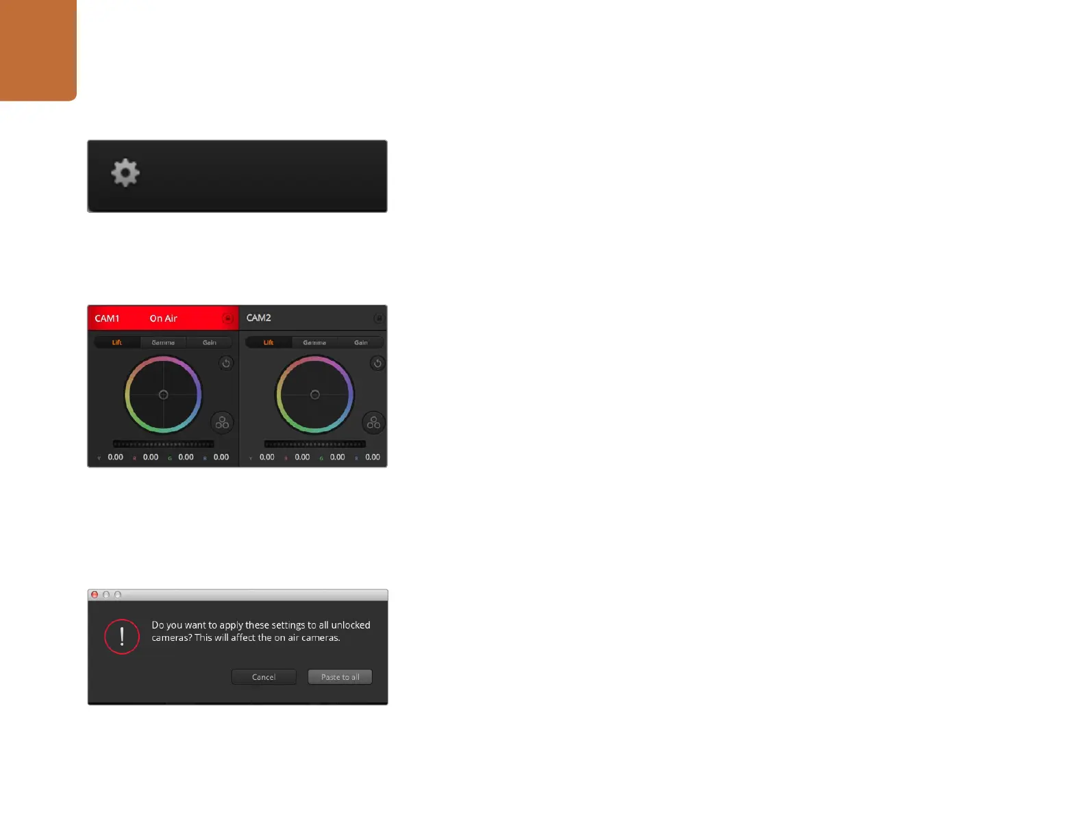 utilisez la fenêtre de correction colorimétrique, il vous suffit d'appuyer sur ces boutons pour sélectionner la caméra
